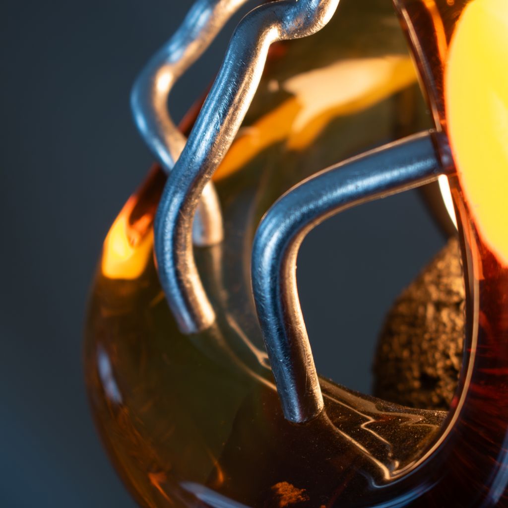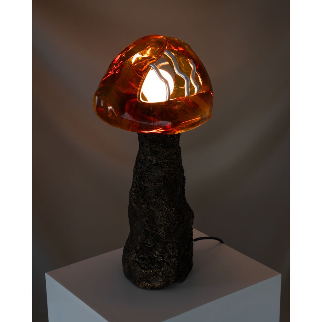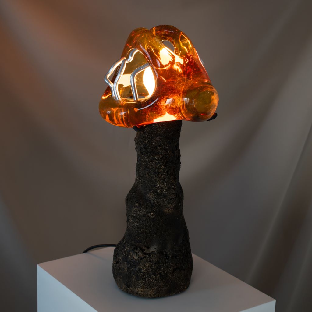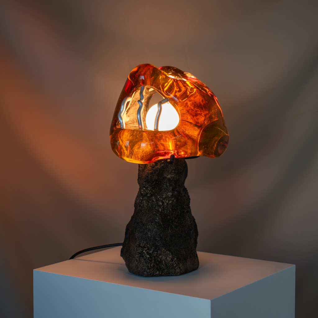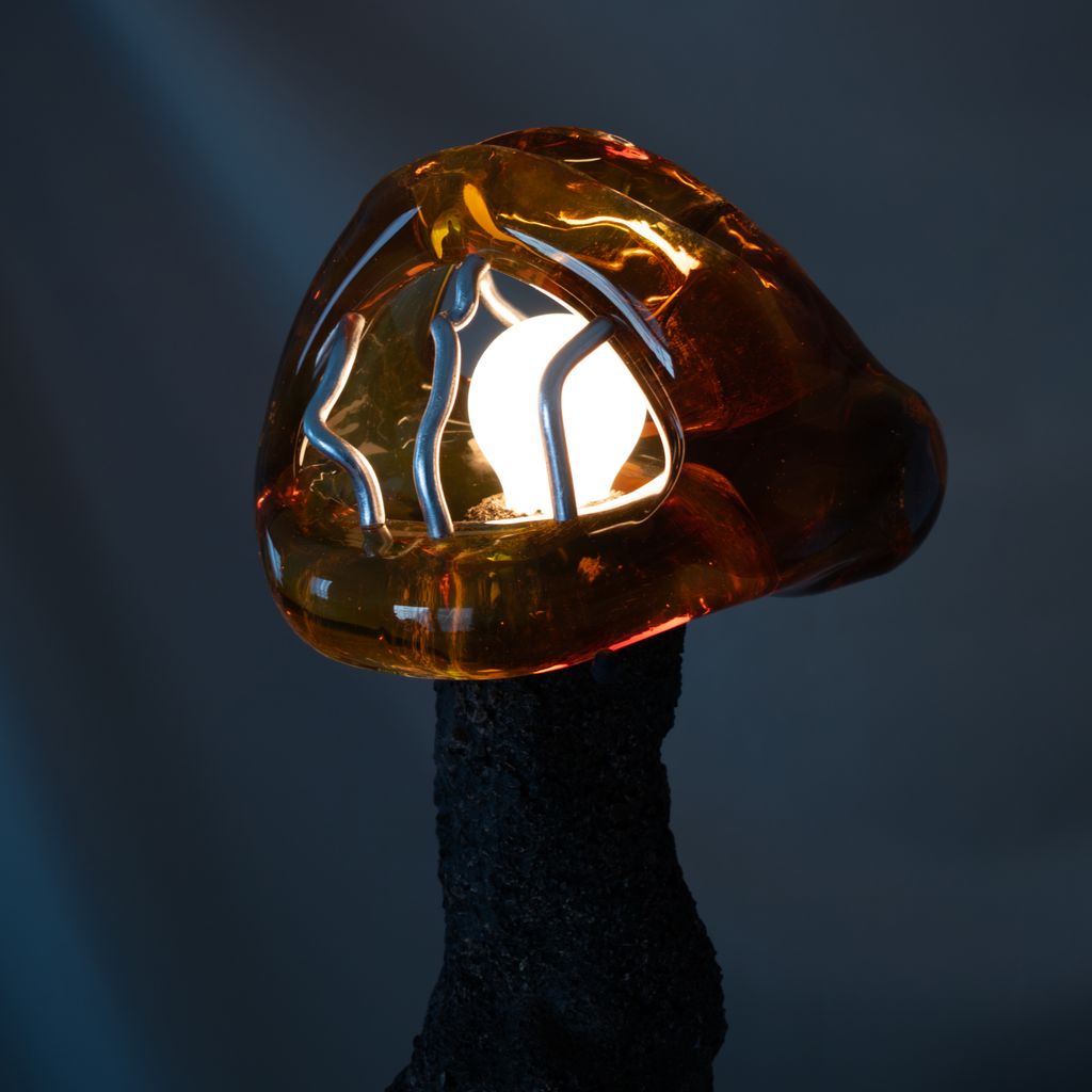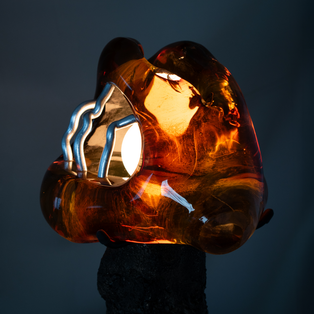 Somehow Honey Dreams Of Fire consists of two handcrafted table lamps. The solid glass lampshades are crafted by French glassmakers. True to the studio’s philosophy, the lamps feature organic characteristics and are designed as companions, pieces you grow attached to and keep over time. Entirely handcrafted, these pieces combine patinated concrete, solid glass, aluminium leaves and steel.