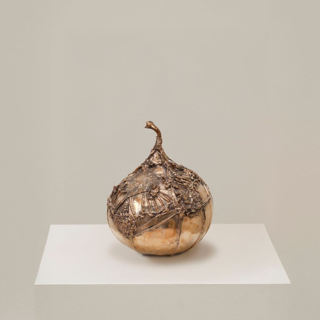 Brazilian artist Sonia Gomes has spent decades transforming soft materials into sculptures that feel alive with history. Here, a bronze cast captures what was once fabric wrapped around an ostrich egg, its creases and stitches frozen in metal. Raised in Brazil’s textile capital of Caetanópolis and self-taught until her forties, Gomes builds her work from improvisation and care, mending, binding, and transforming discarded materials into something enduring. In this candelabra for Side Hustle, what once seemed delicate has become solid, a small monument to the resilience found in making by hand.