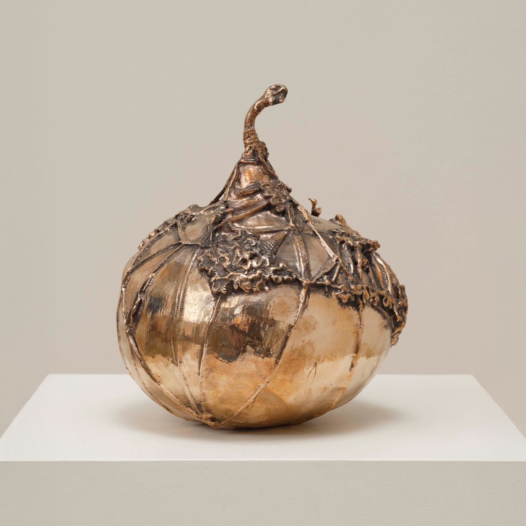 Brazilian artist Sonia Gomes has spent decades transforming soft materials into sculptures that feel alive with history. Here, a bronze cast captures what was once fabric wrapped around an ostrich egg, its creases and stitches frozen in metal. Raised in Brazil’s textile capital of Caetanópolis and self-taught until her forties, Gomes builds her work from improvisation and care, mending, binding, and transforming discarded materials into something enduring. In this candelabra for Side Hustle, what once seemed delicate has become solid, a small monument to the resilience found in making by hand.