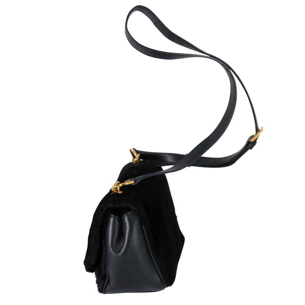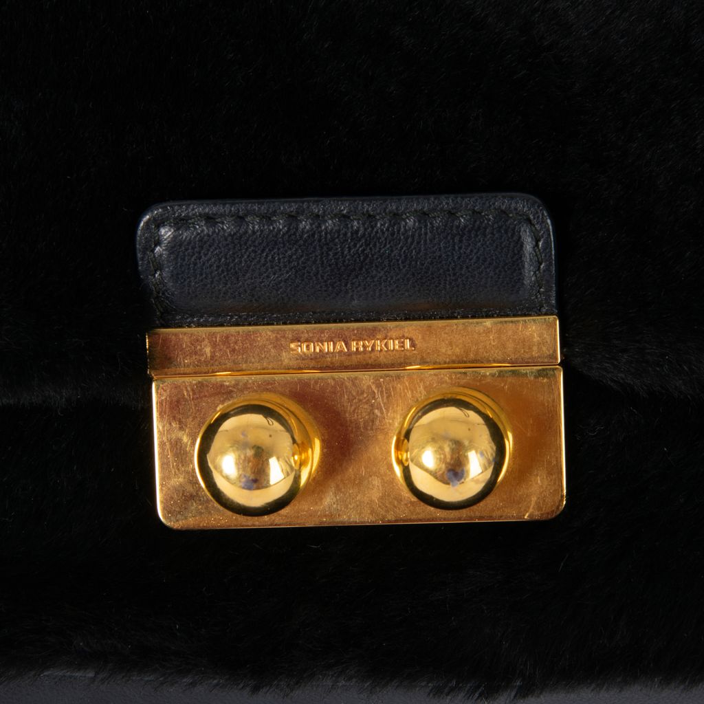 This Sonia Rykiel crossbody bag features a kangaroo fur outer, a front gold-tone hardware closure, cotton lining, a flat pocket interior, and has an adjustable strap. Gently worn, in excellent condition.