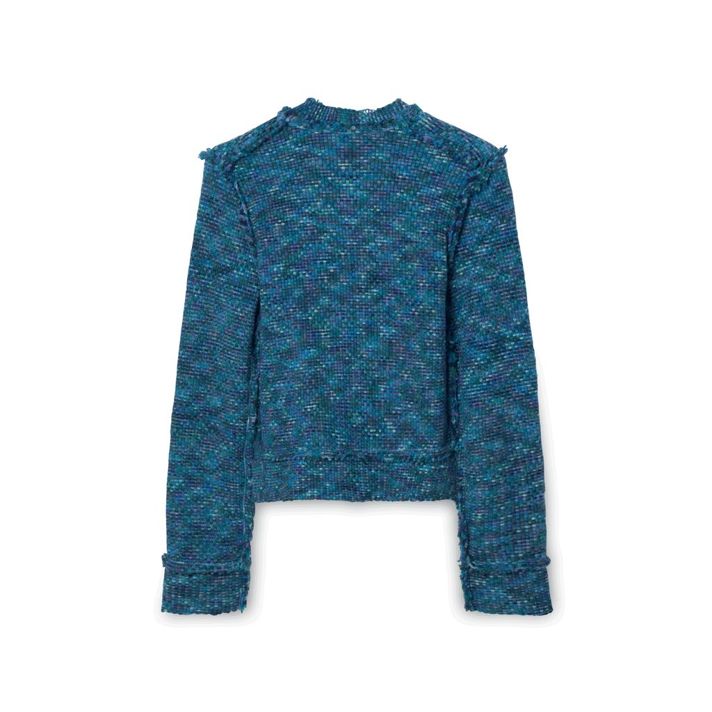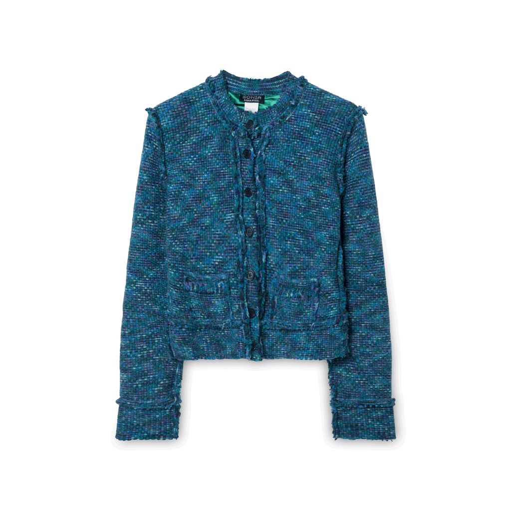 Sonia Rykiel knit cardigan features turquoise, blue, and green wool yarn, black buttons, and dual pockets at the waist.