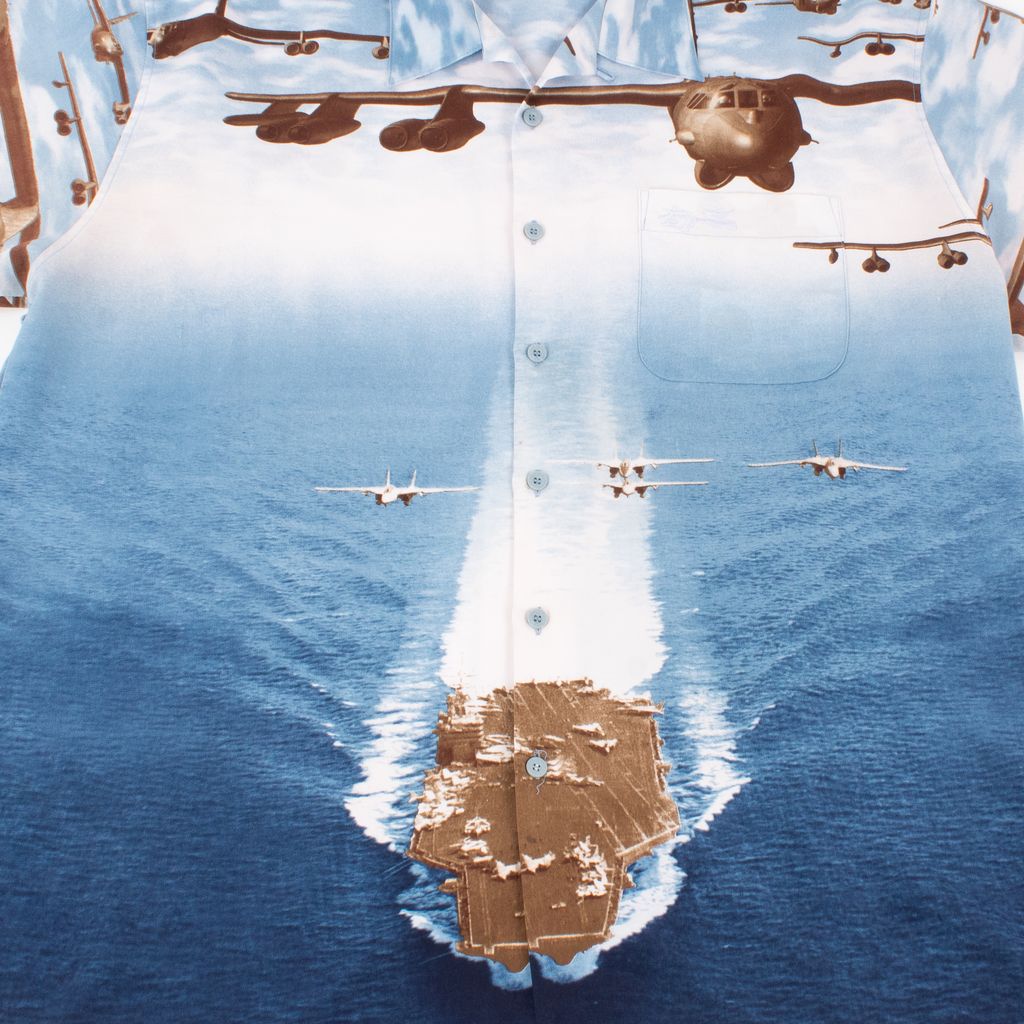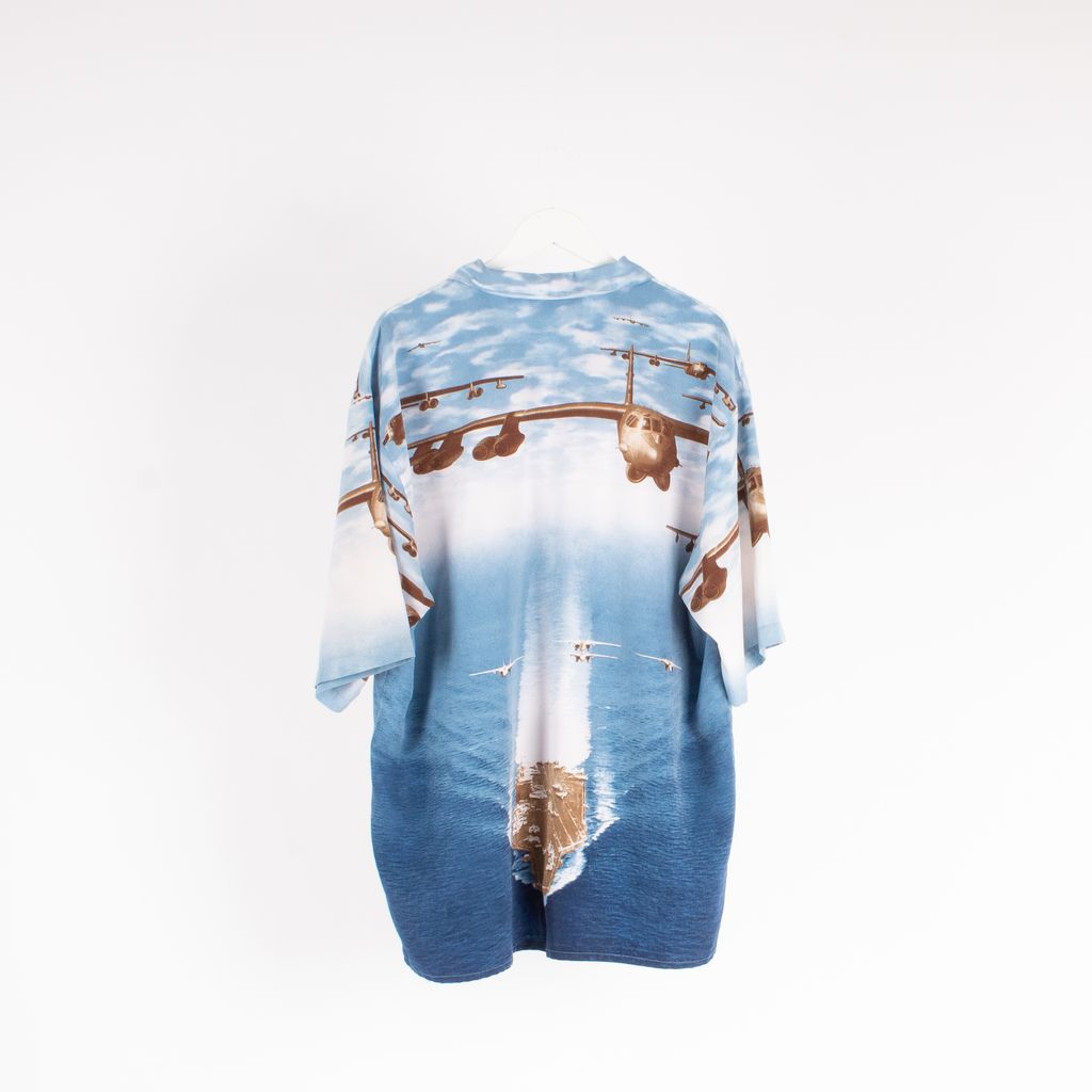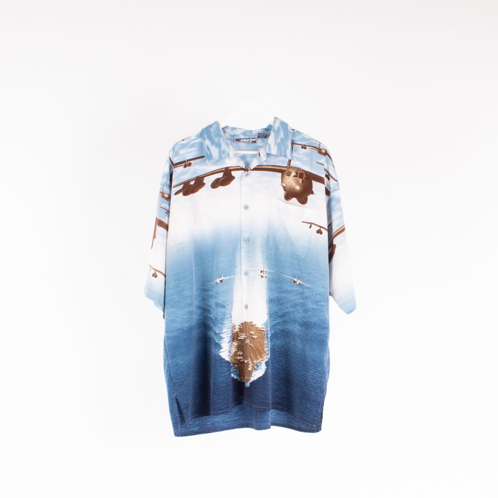 This button down from South Pole is oversized and funky for all your borrowed from the boys looks. Features airplane and carrier all over print, button down front, oversized body, and front chest pocket.