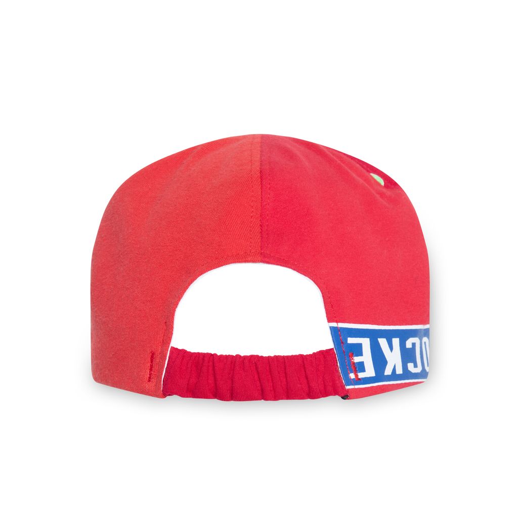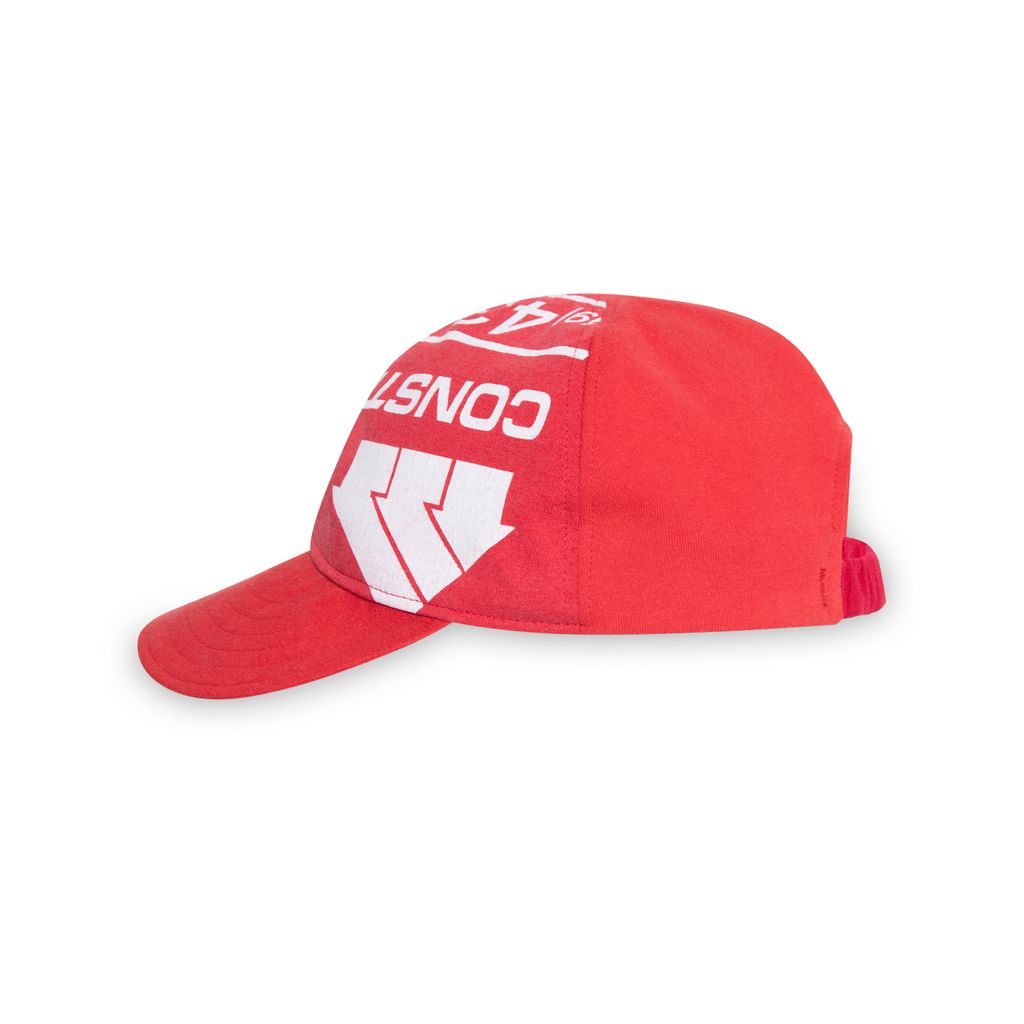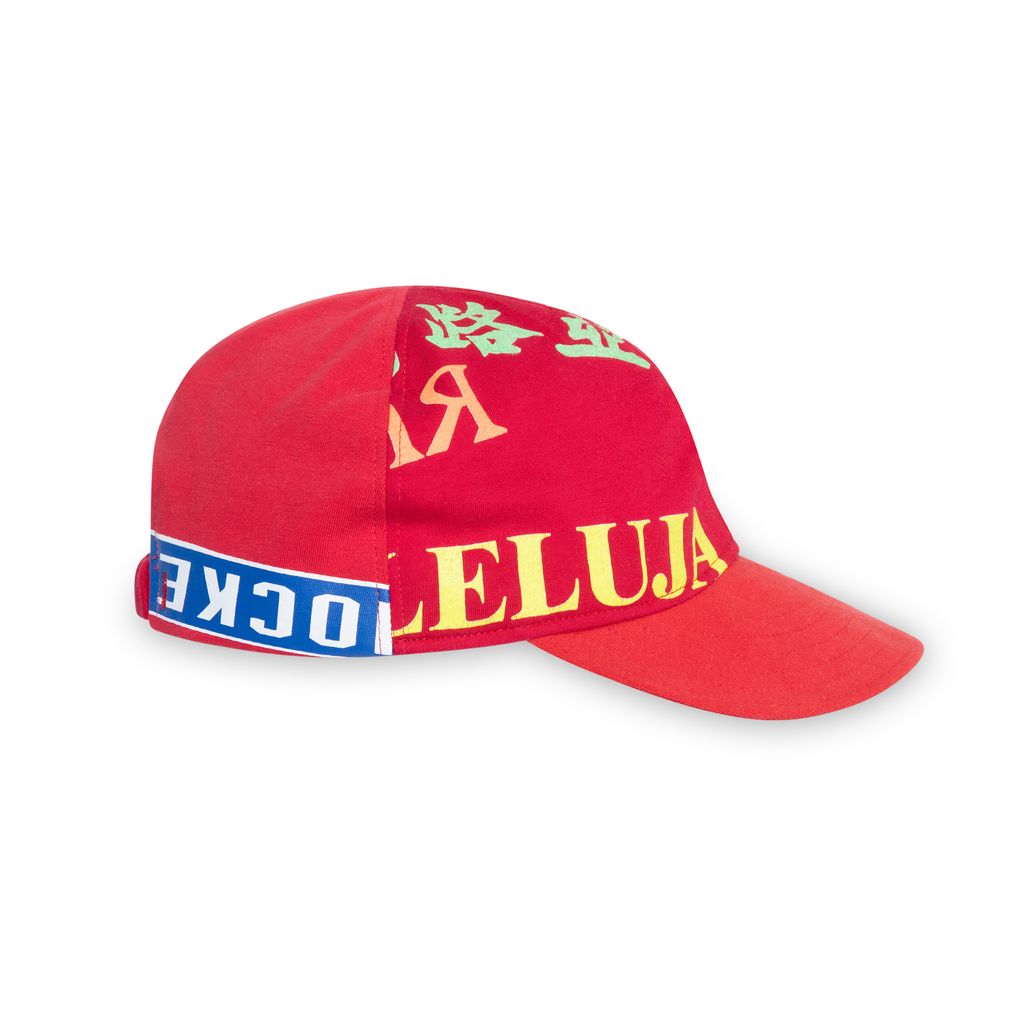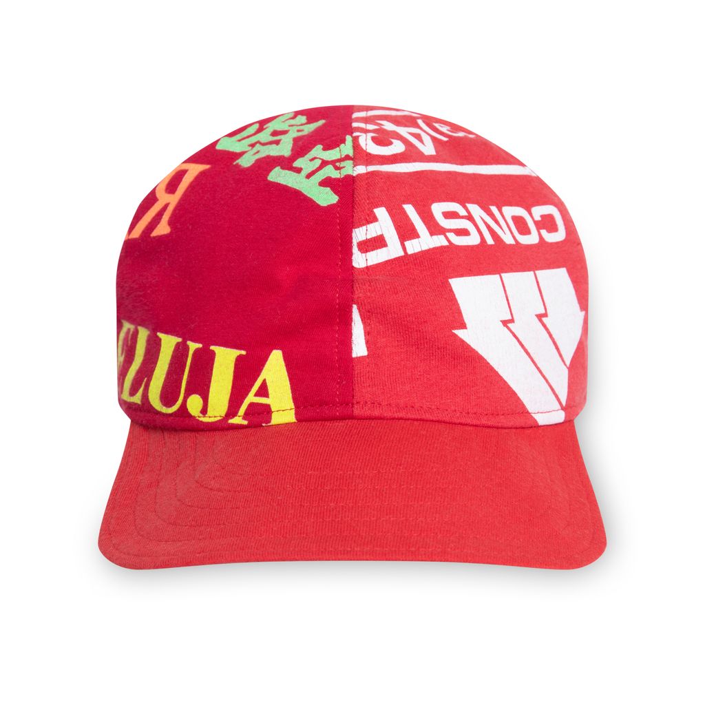 Souvenir Cap Red is a 1 of 1 cap handcrafted from upcycled T-shirts. Elasticated back and cotton lining. Made in UK.