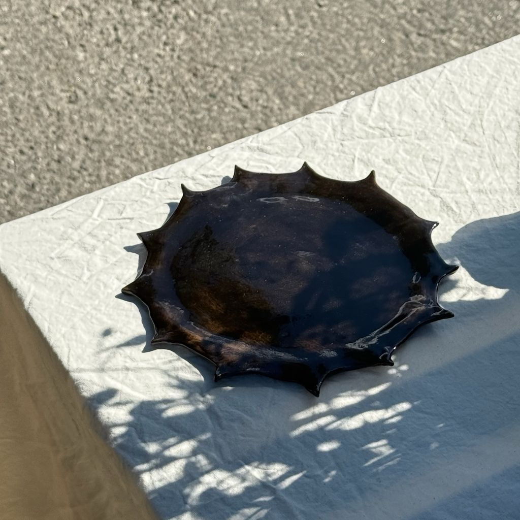 Black / Grey stoneware clay with blqck underglaze and finished with a glossy glaze in Brown / Black tones.