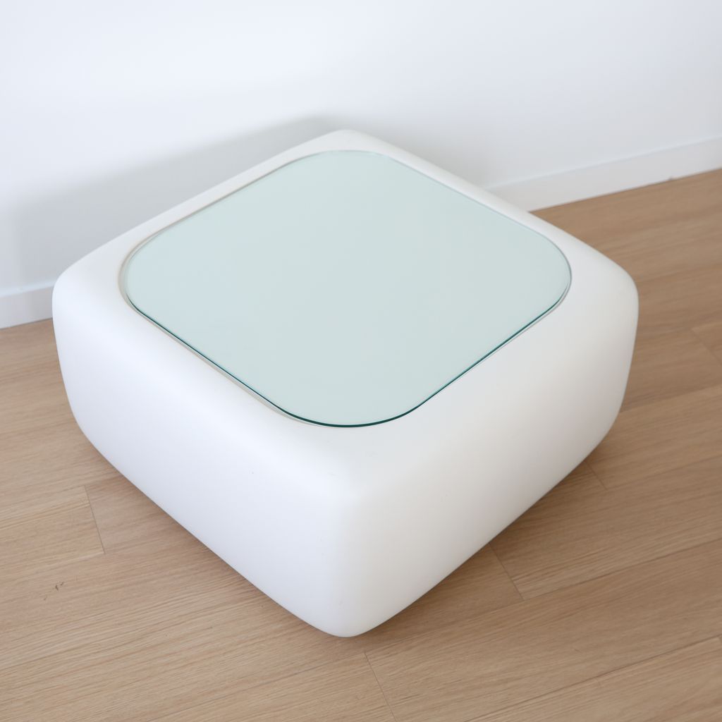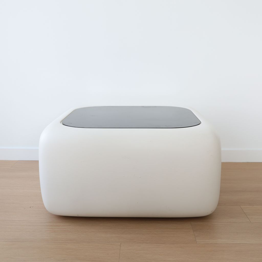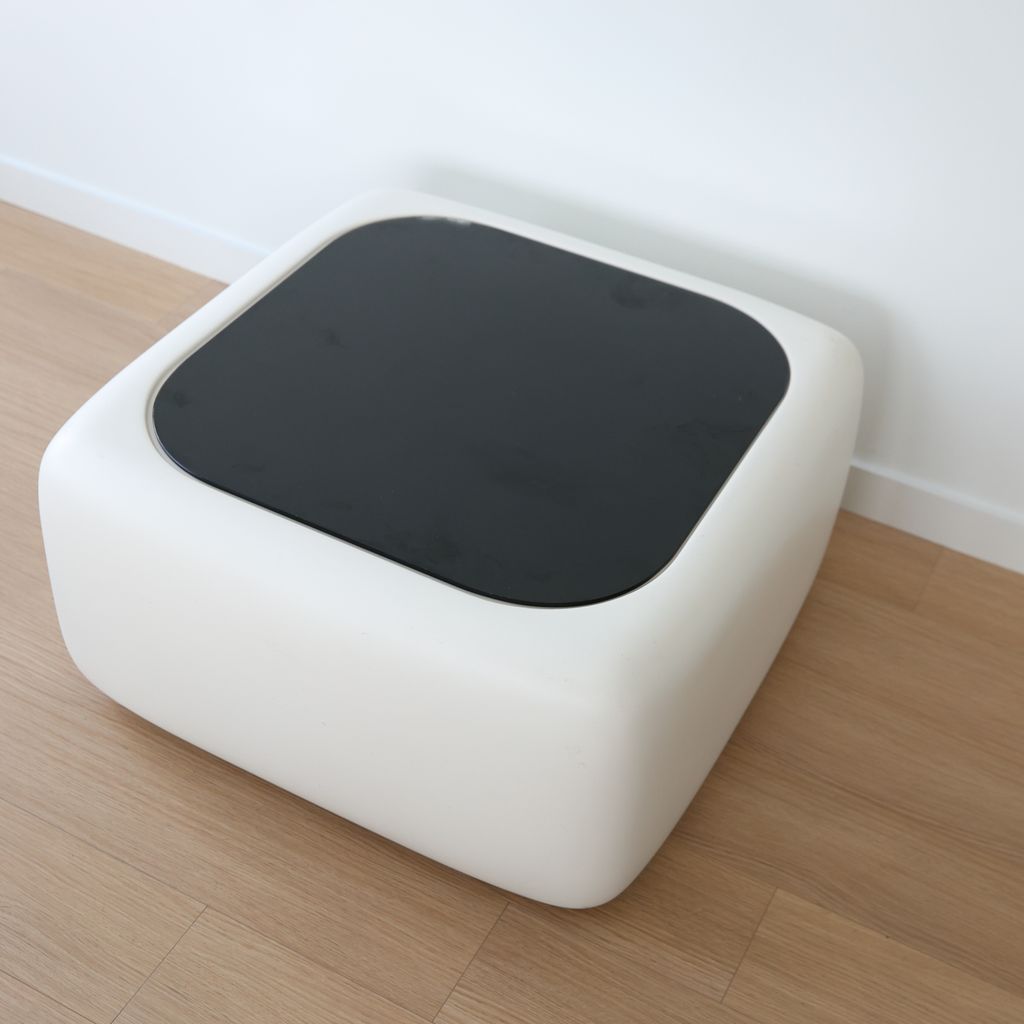 Space Age side table from soft seating series designed by William Andrus for Steelcase. These tables can be side tables or due to the large size, a smaller coffee table. They do not have the floating bottom pieces, which is reflected in the price, but look just as beautiful and sleek without. This item is in great vintage condition with normal to minor vintage wear with brand new glass.