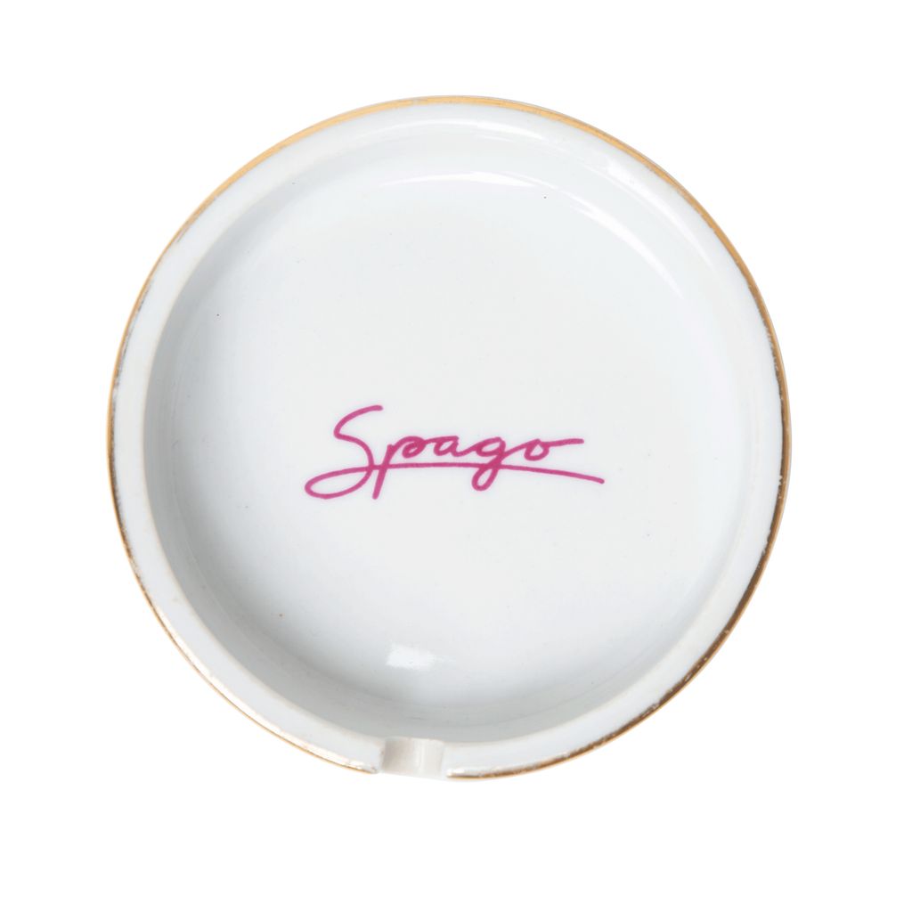 Spago Beverly Hills Ashtray features pink printed text on white porcelain with gold trim.