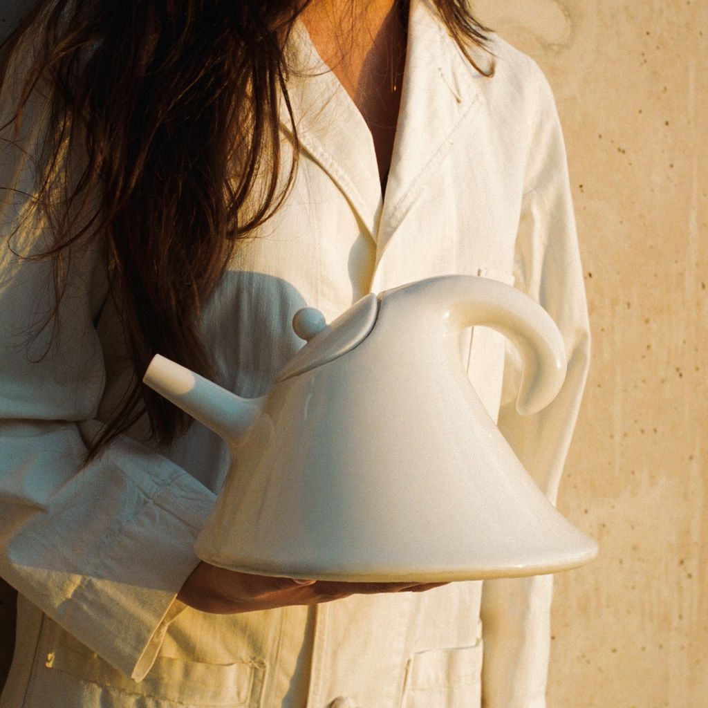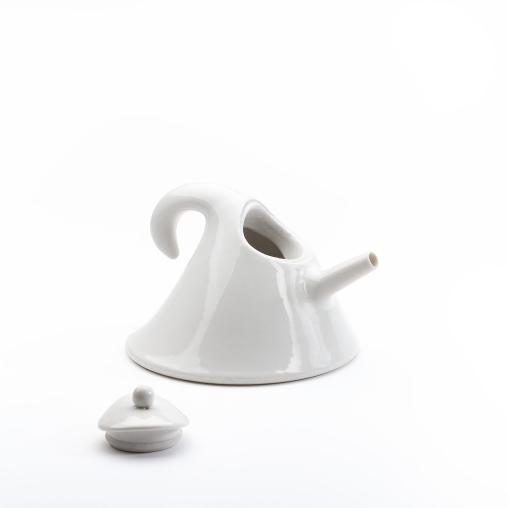 Handmade from their in-house fine porcelain recipe, the teapot features an organic spiraling form, a vertical lid, and a stout bottom. Finished in a silky white gloss, each piece is produced in small batches.