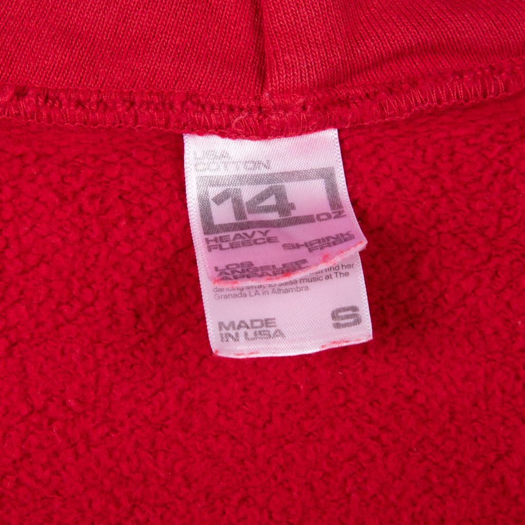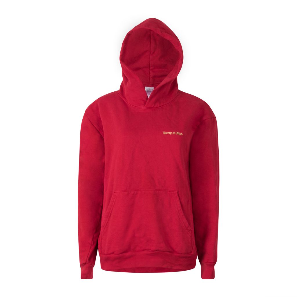 This pullover sweatshirt from the LA athleisure and wellness brand, Sporty & Rich, features long ribbed cuff sleeves, front kangaroo pocket at waist, and attached hood. Gently worn.