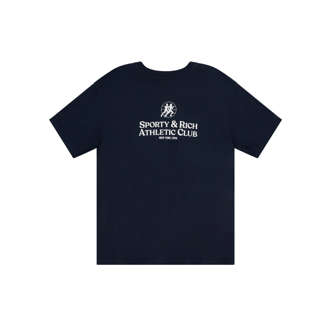 Sporty & Rich Athletic Club Tee features pullover fit, printed text on front.