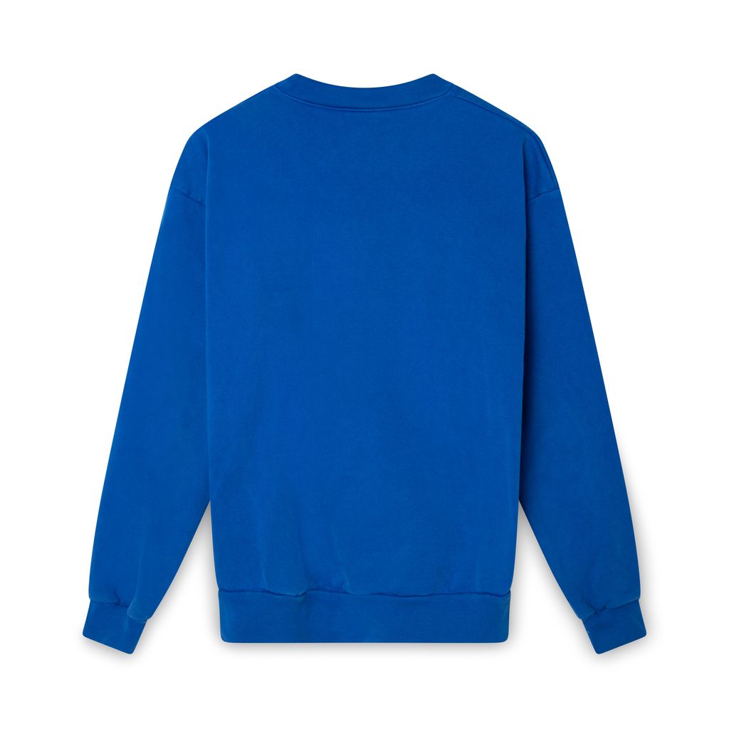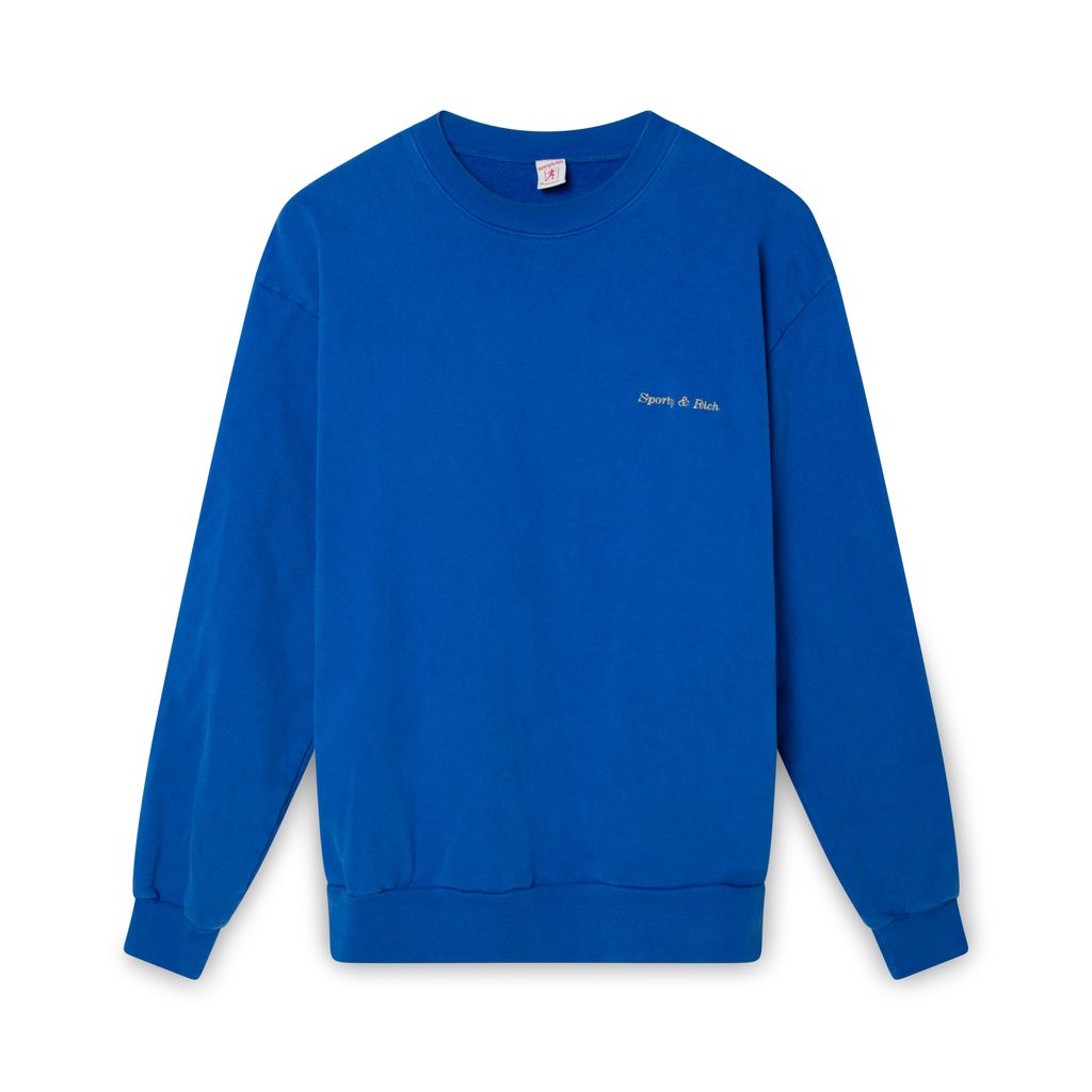 Sporty & Rich Blue Crew Neck features Sporty & Rich embroidered logo on the front left, ribbing at collar, wrists, and hem.