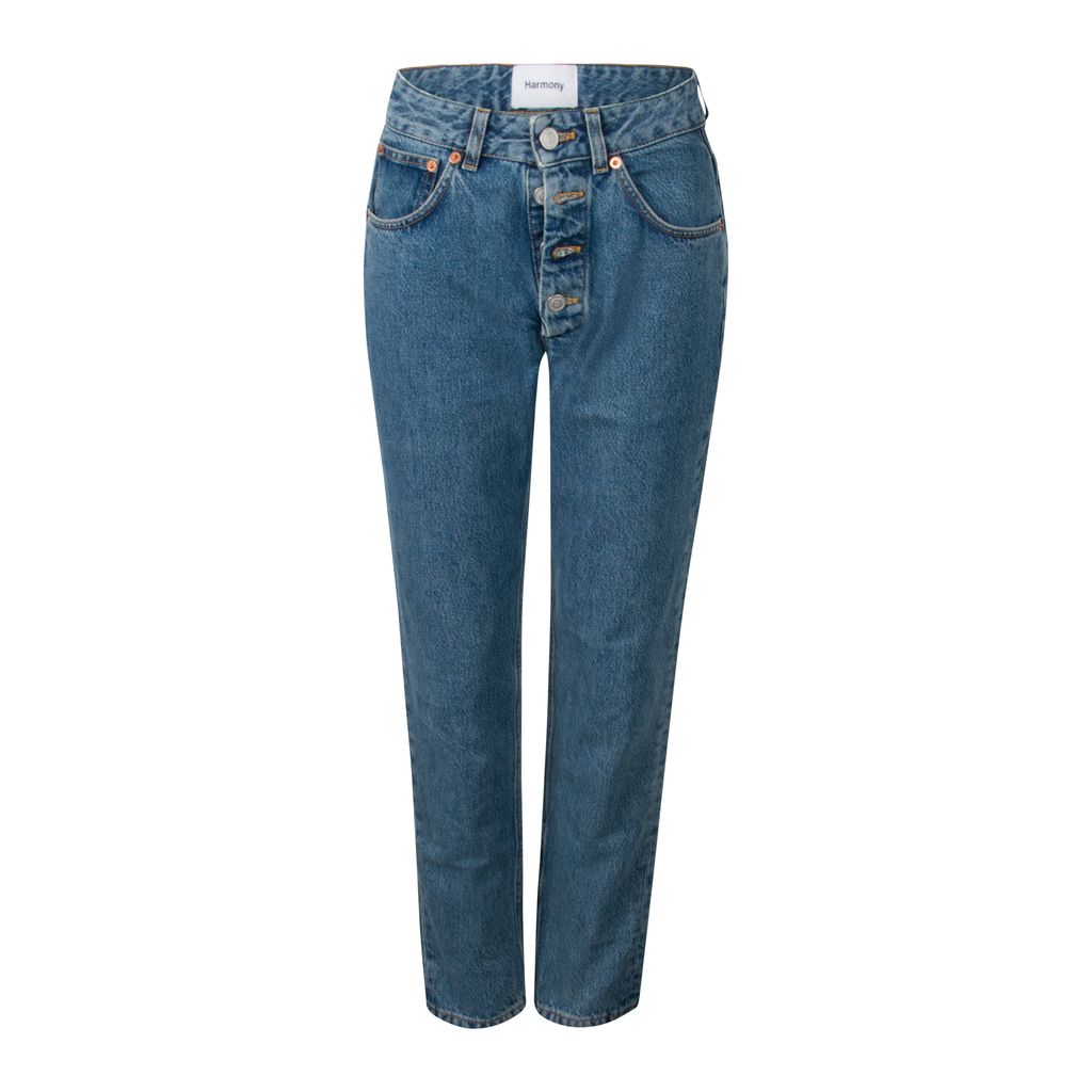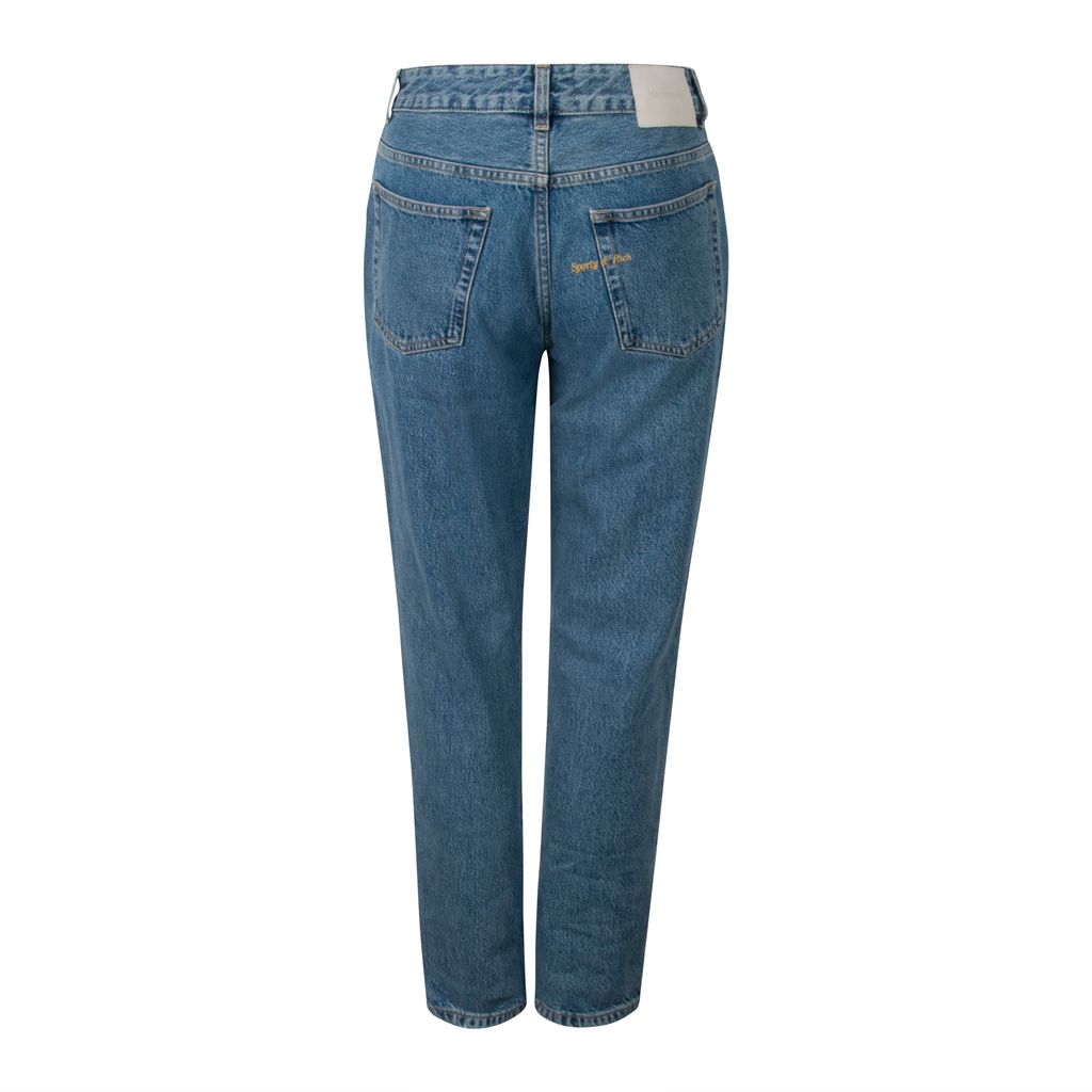 These jeans from Sporty & Rich x Harmony Paris have a high waisted mom jean fit and feature a button-fly closure along with functional front/back pockets. These jeans have a true vintage denim blue wash to them and are in excellent condition. Sporty & Rich embroidered logo at the back pocket.
