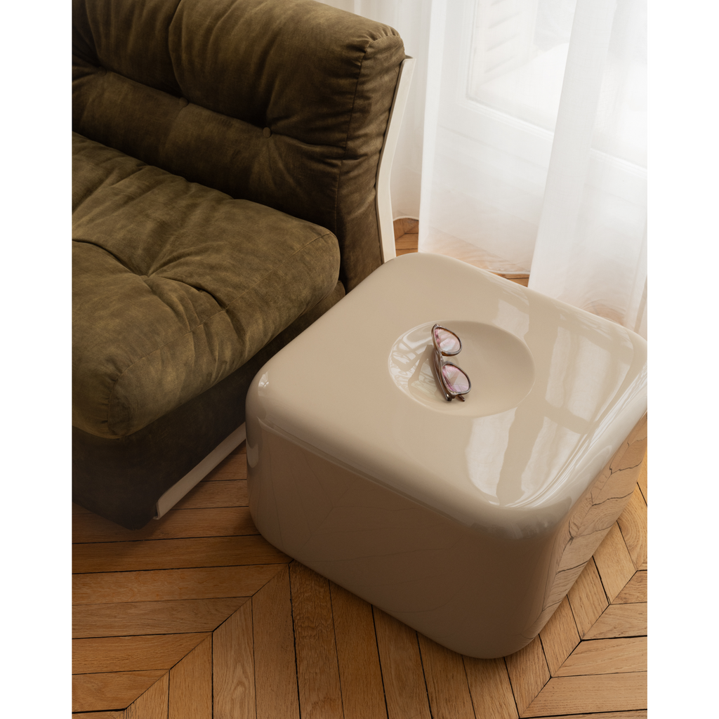 Each table is meticulously handcrafted by master artisans using fiberglass, which is first cast in molds and then manually coated and polished multiple times to achieve different high-gloss finishes. The entire production process is done by hand, requiring a high level of craftsmanship for every piece. The modular tables come in five colors: white, brown, green, red, and anthracite.