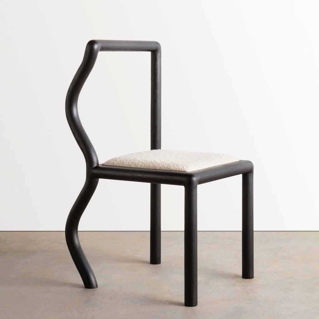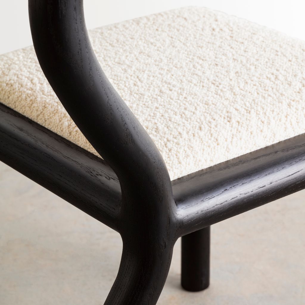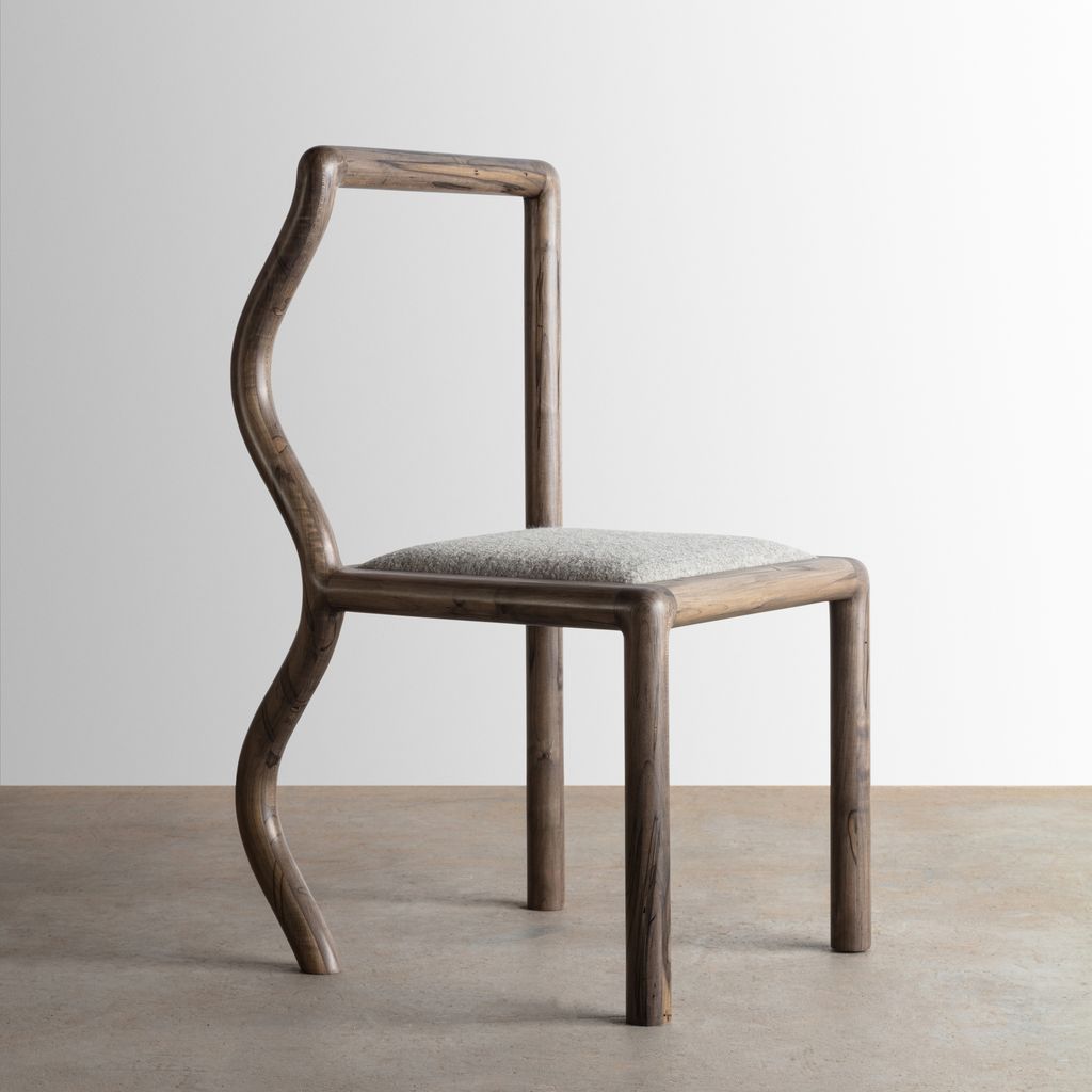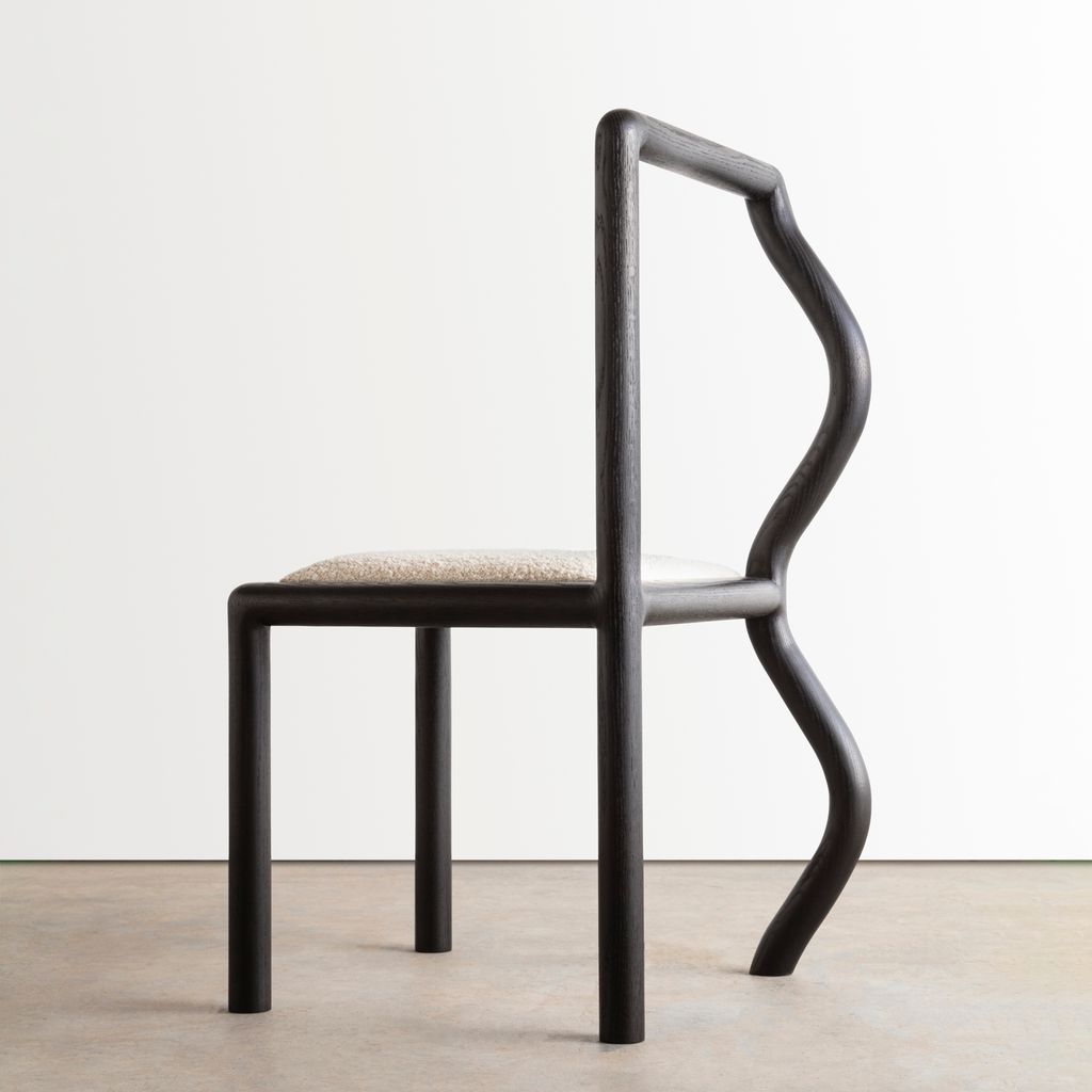The Squiggle Chair was created through an exploration of shaping solid slab lumber. Designed to bring a smile to any space, each chair part is thoughtfully selected to highlight the grain pattern and characteristics of the wood used. The seat is upholstered with a natural boucle fabric to elevate its form and ensure comfort.