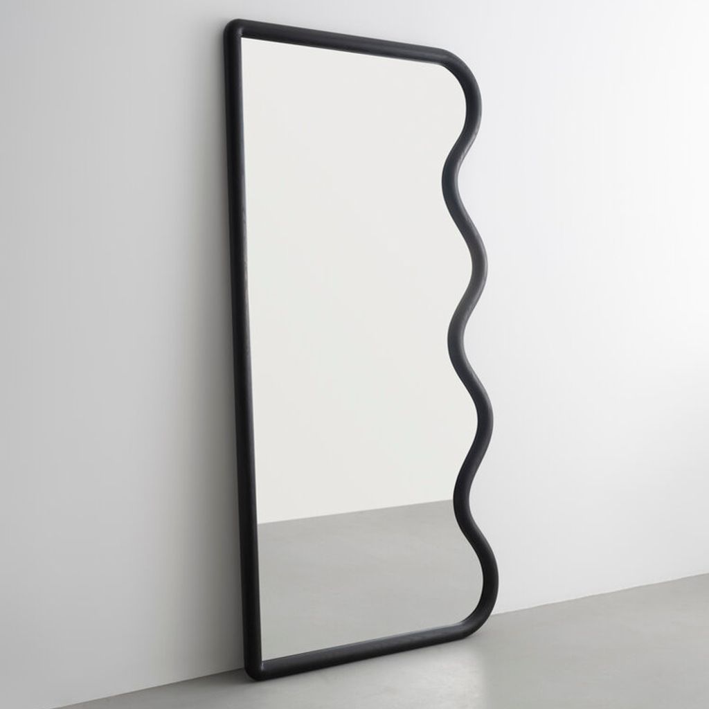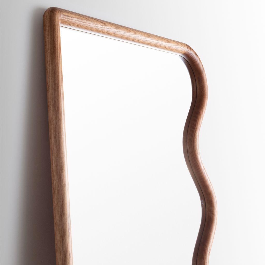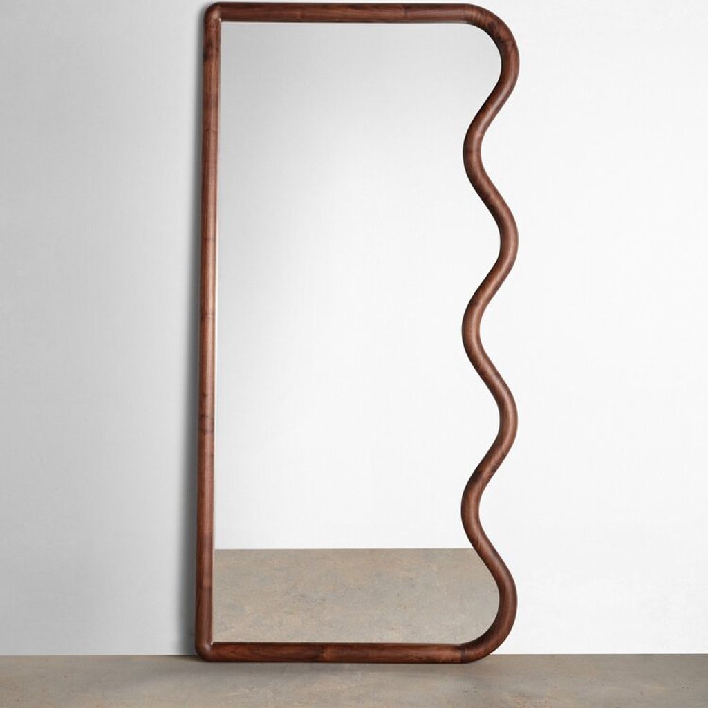 The full-length squiggle mirror is made to order and can be hung vertically or horizontally with its custom French cleats.