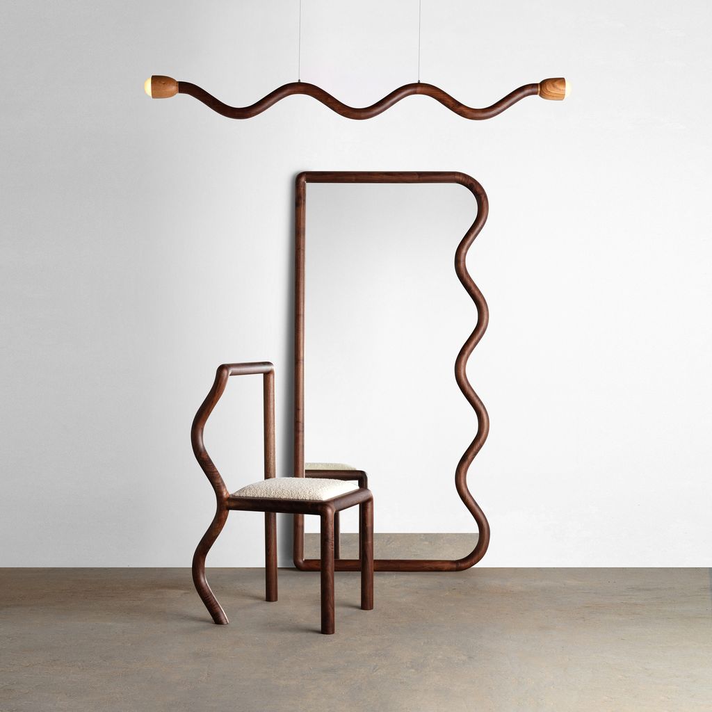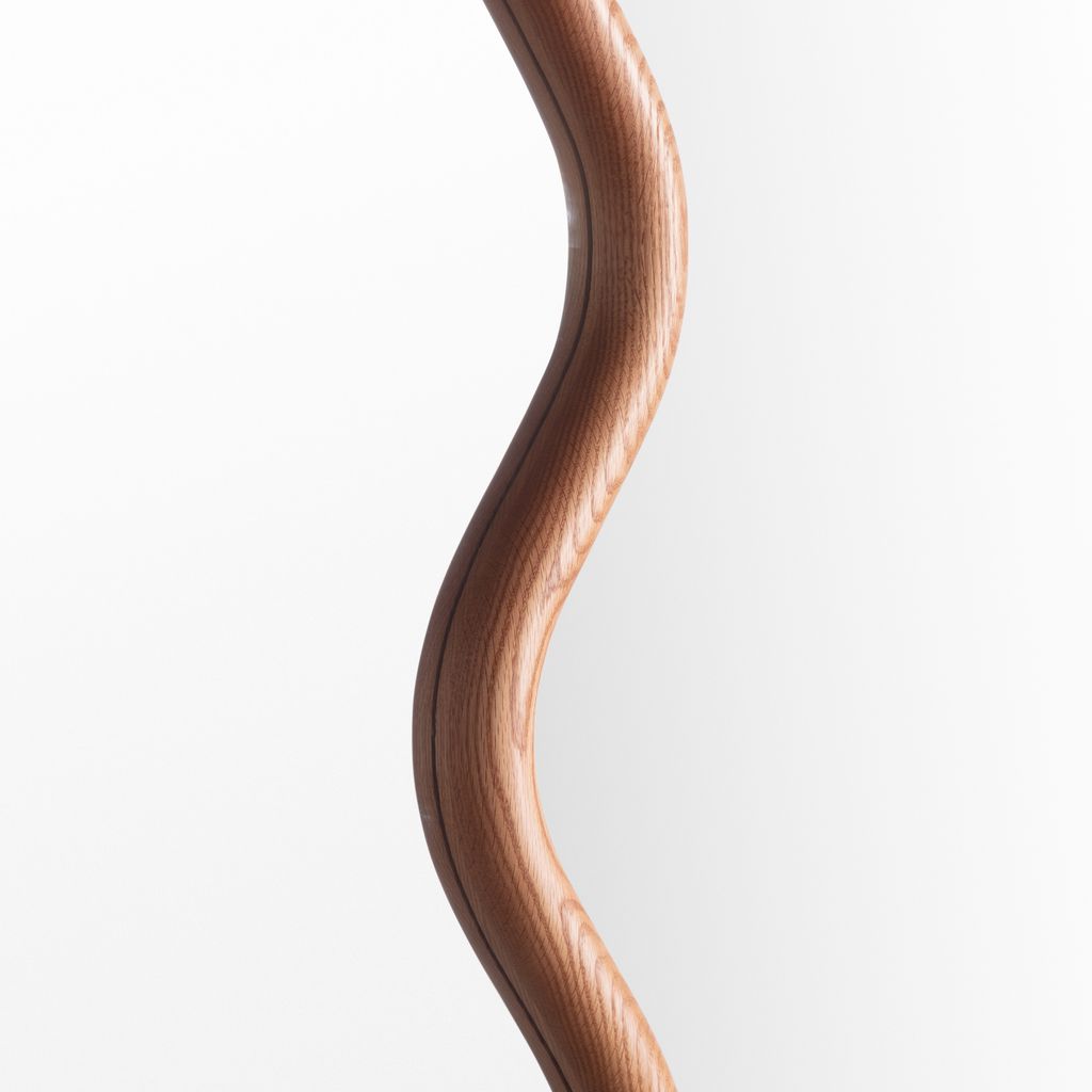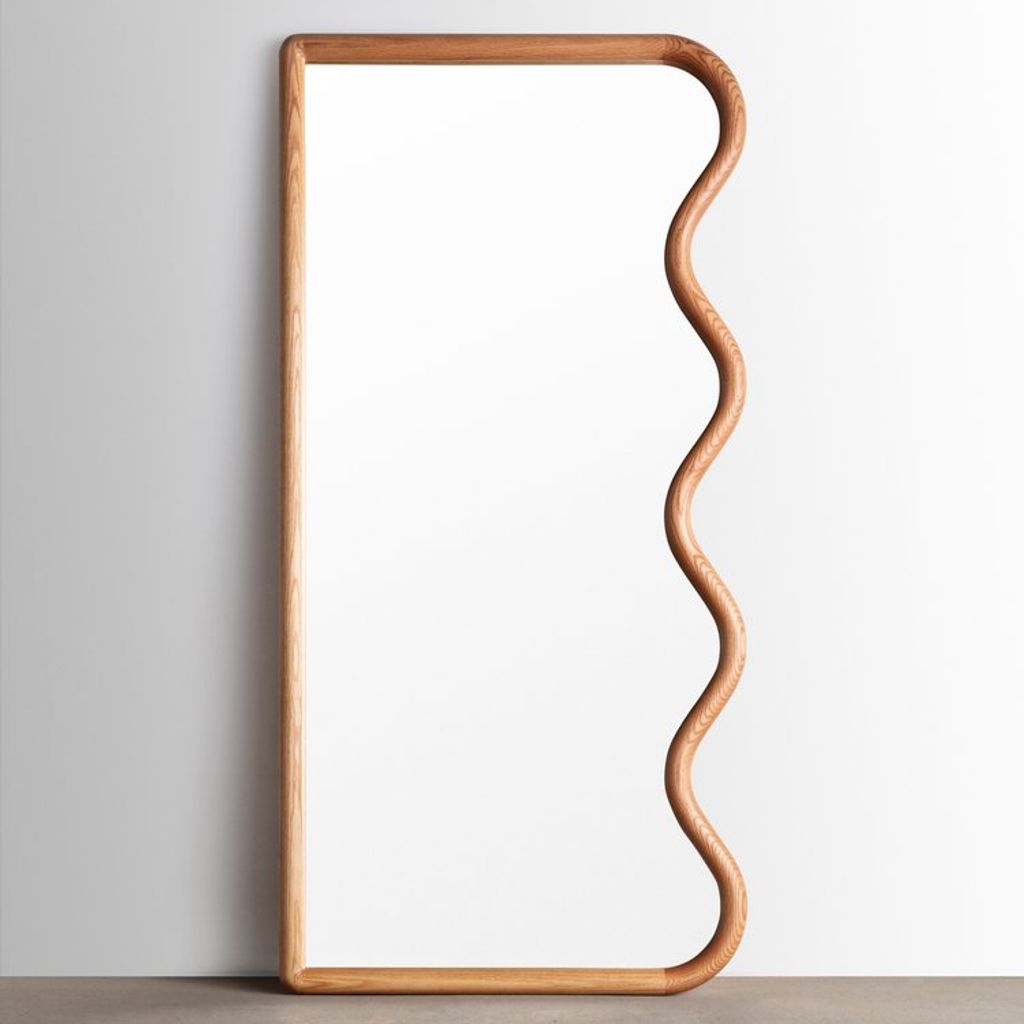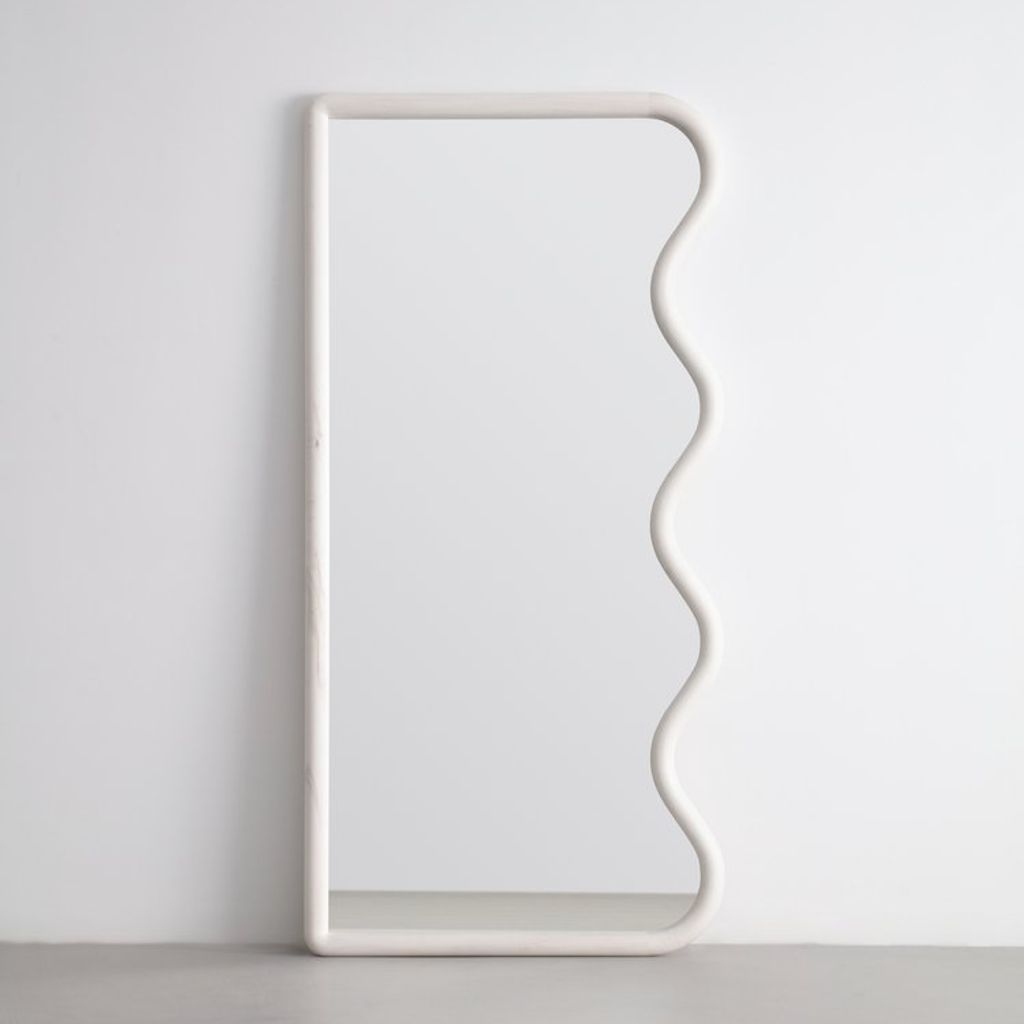 The full-length squiggle mirror is made to order and can be hung vertically or horizontally with its custom French cleats.