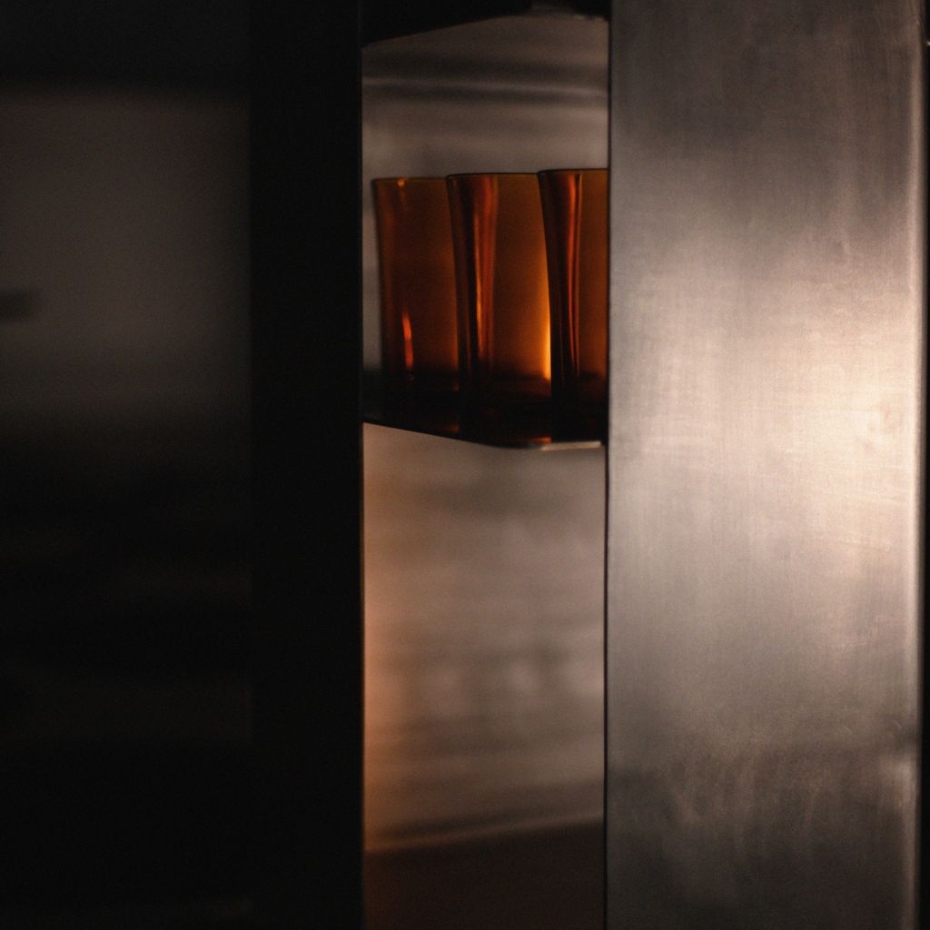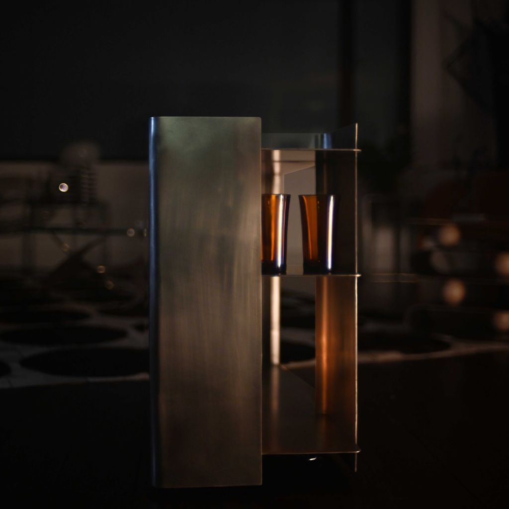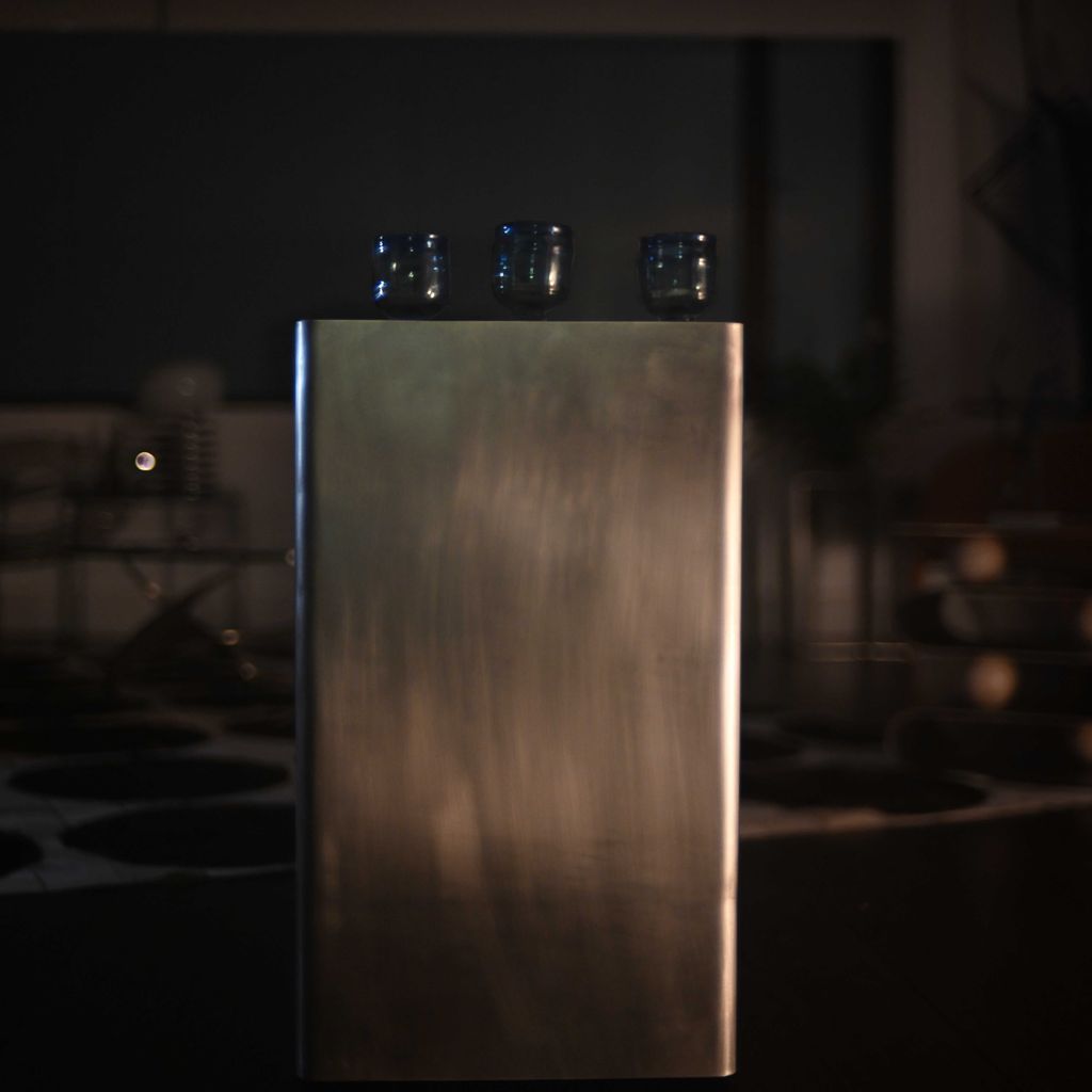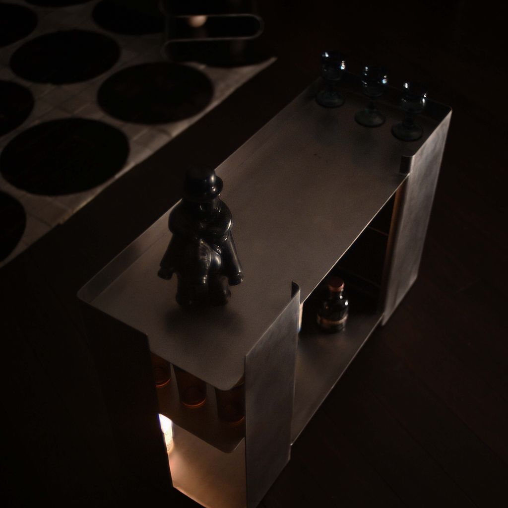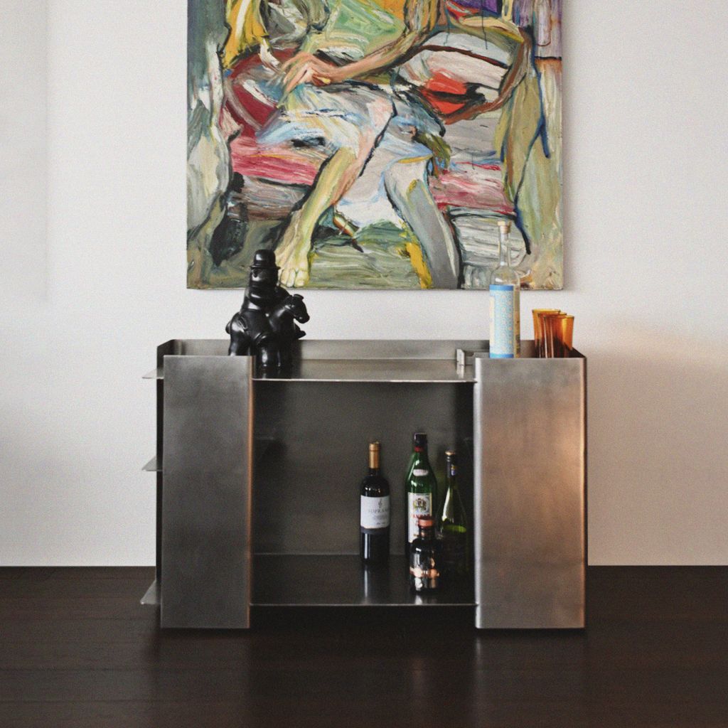 This mobile bar cart is handcrafted of stainless steel and has a strong, geometric presence. Its clean lines and sharp angles give it a solid, functional look, and the surface reflects light with a cool, metallic clarity.