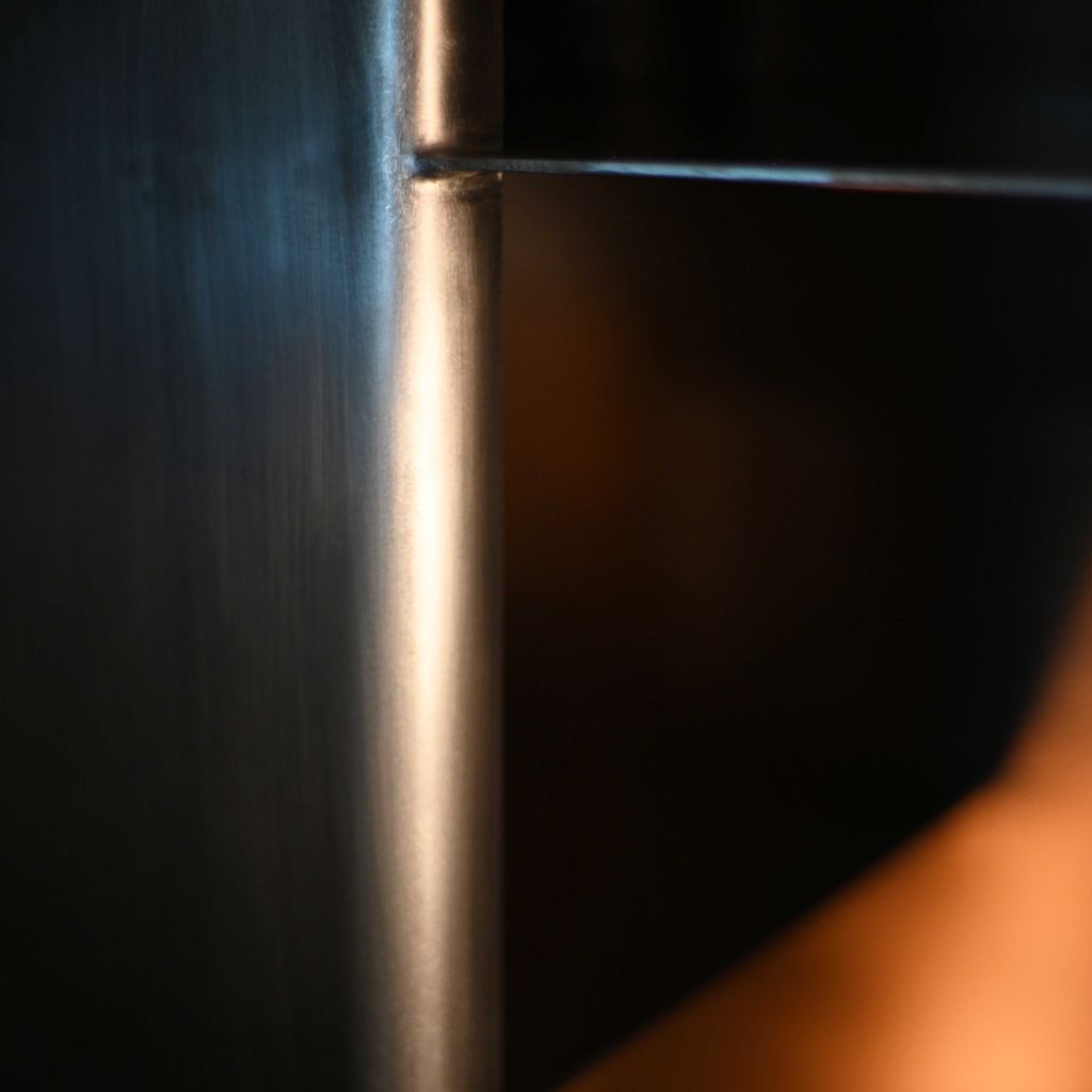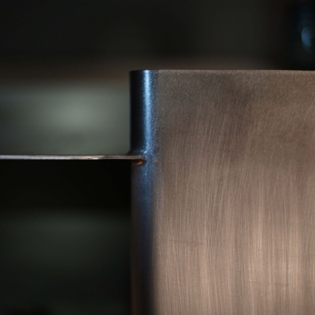 The exposed steel, left bare and uncoated, shows its natural variations and texture, giving the piece a raw, honest character.