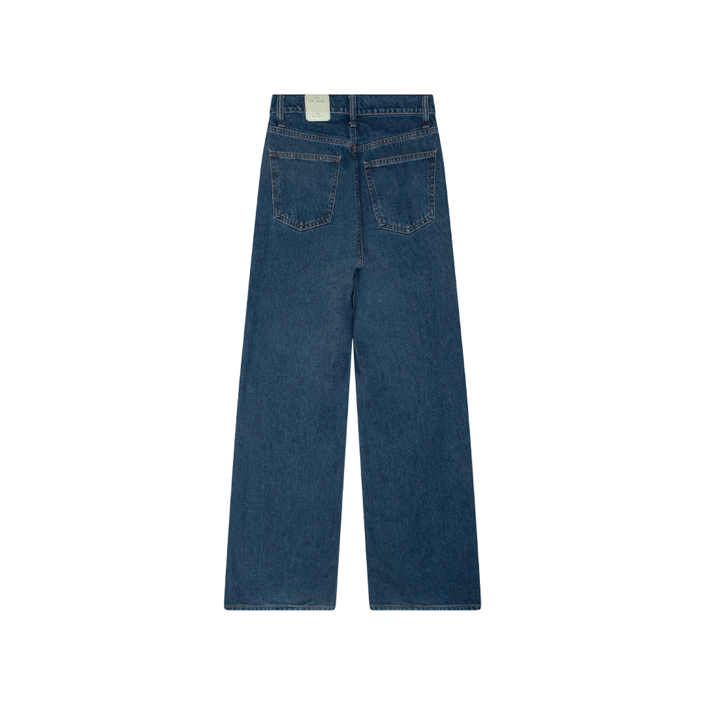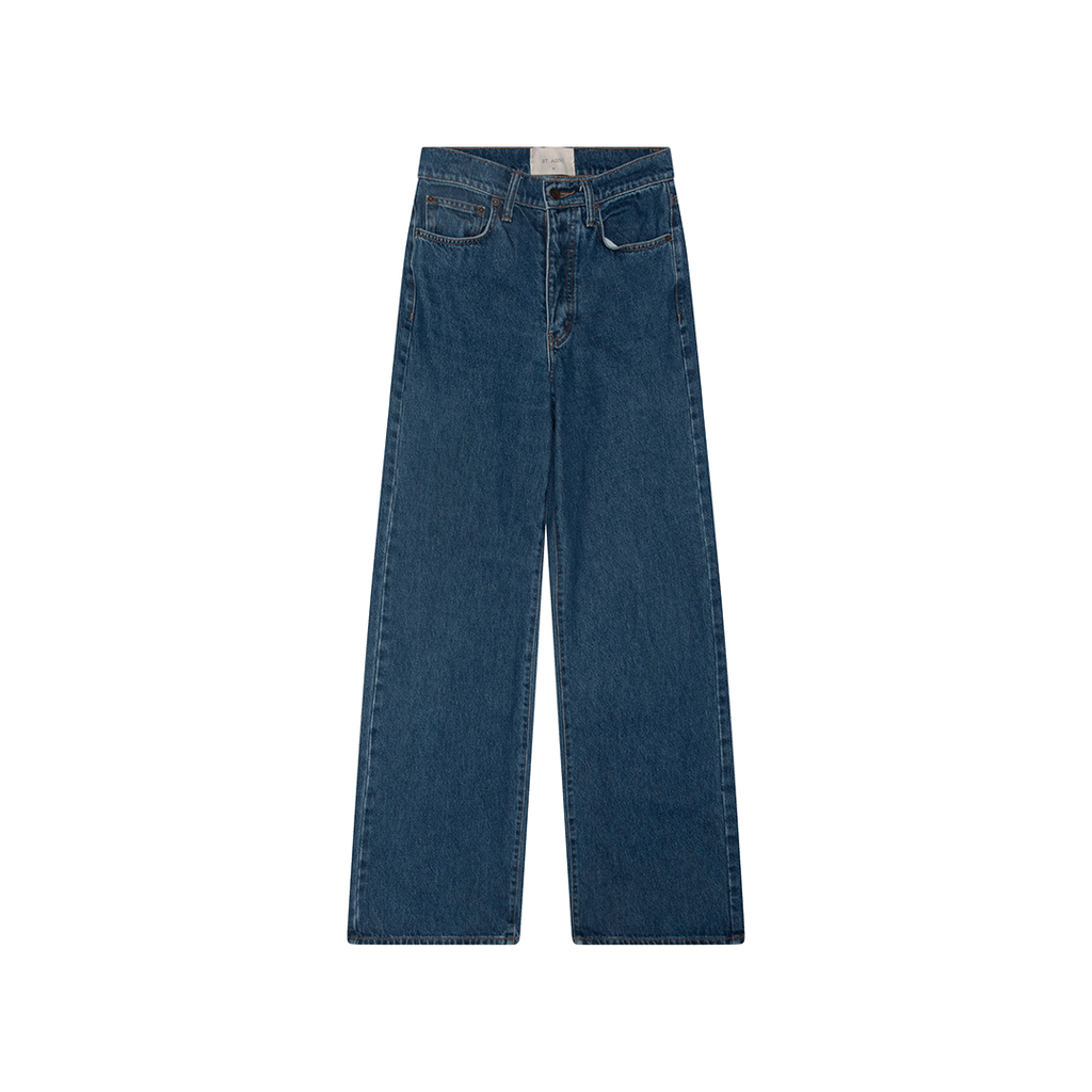 St. Agni Blue High Rise Wide Leg Jeans features high rise waist, wide leg fit, partially concealed button fastening along front, and 5 pocket styling.