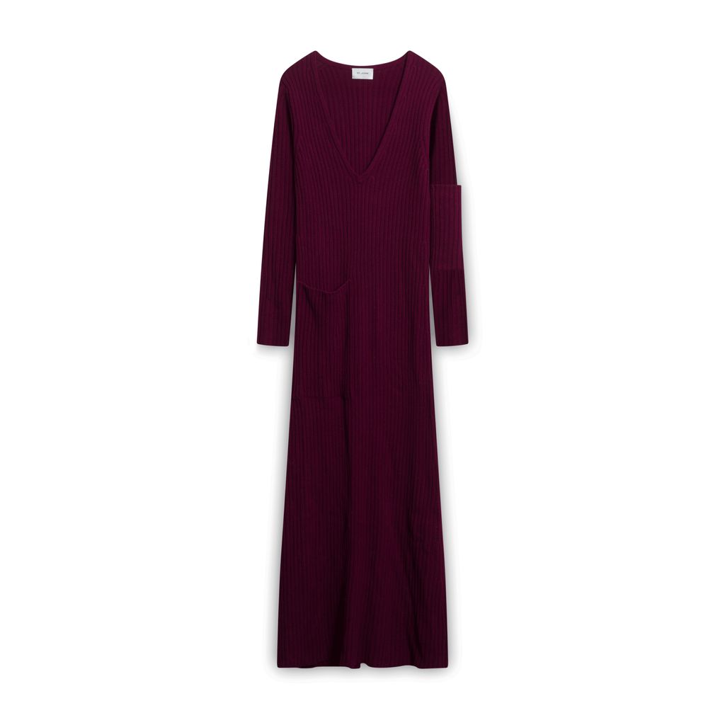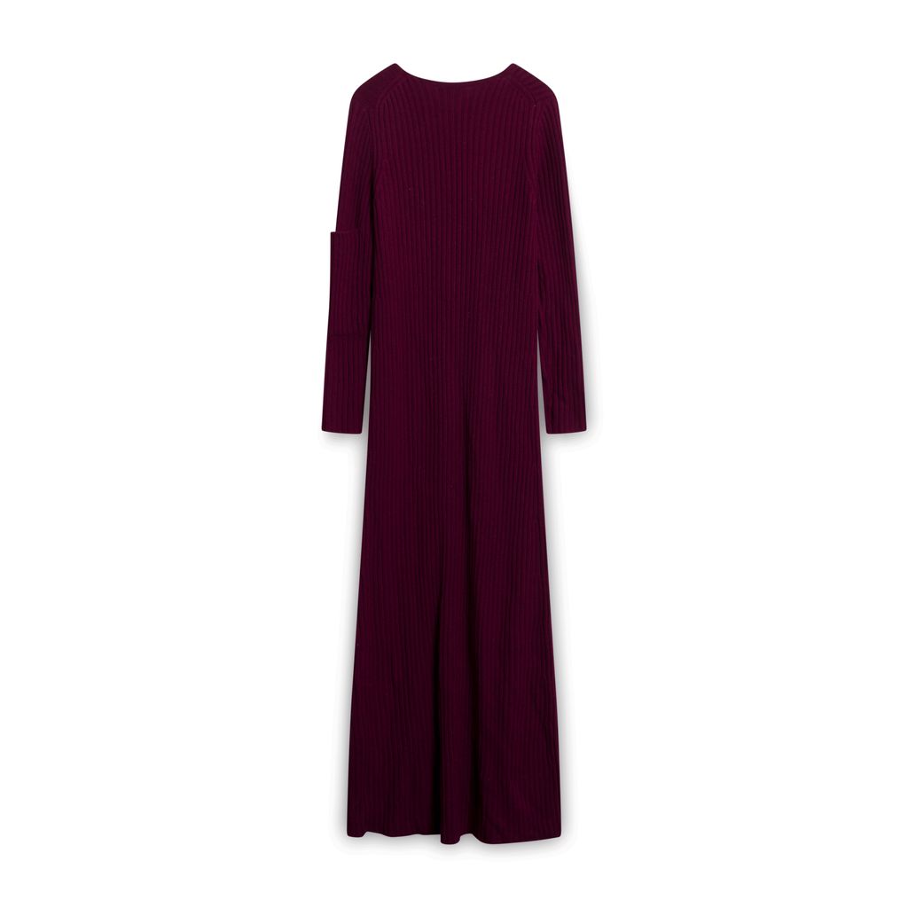 Maroon ribbed knit dress with a large pocket at the right waist.