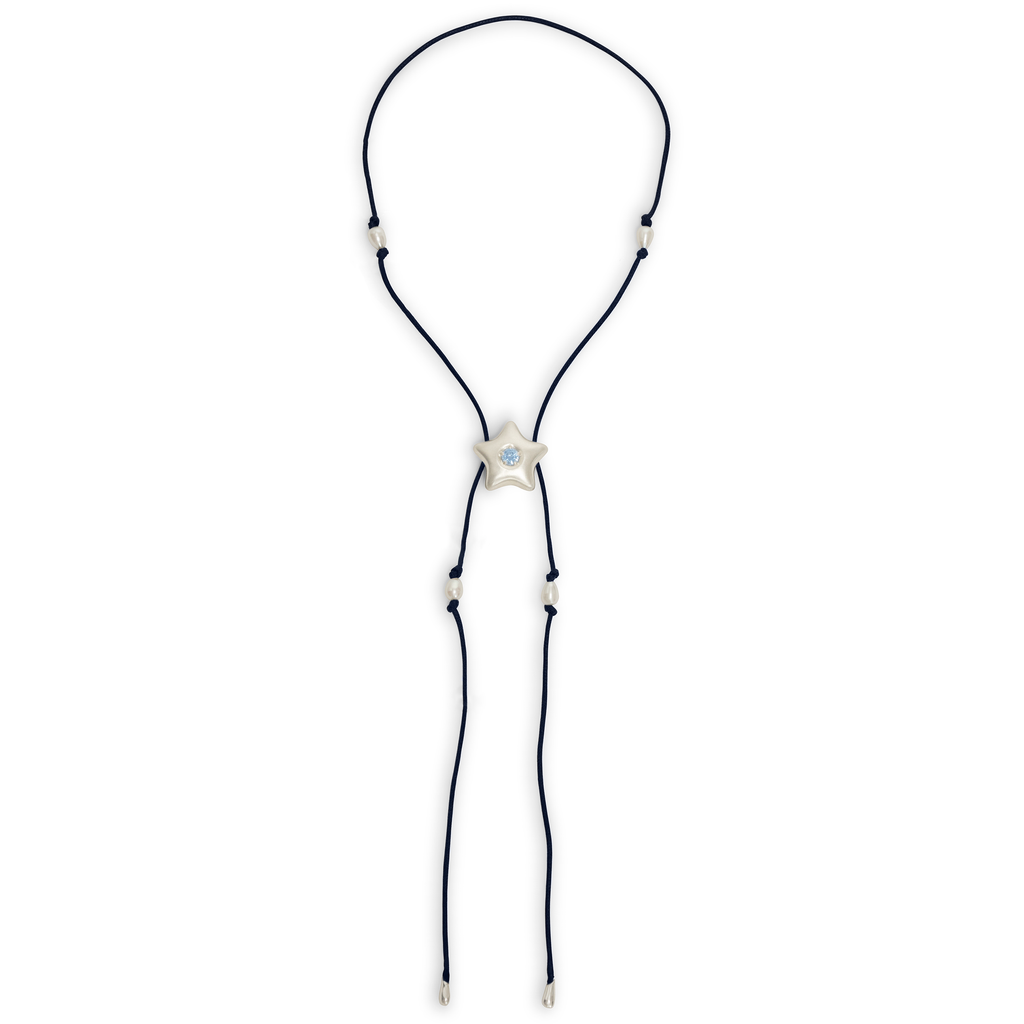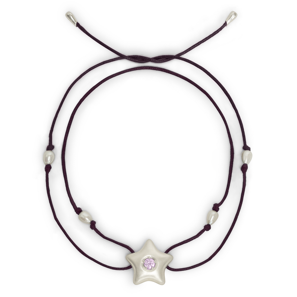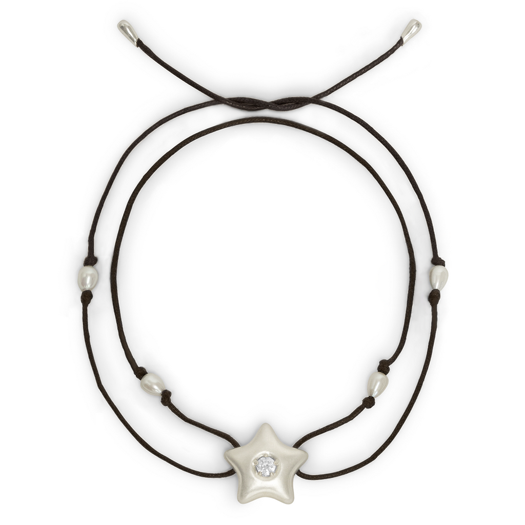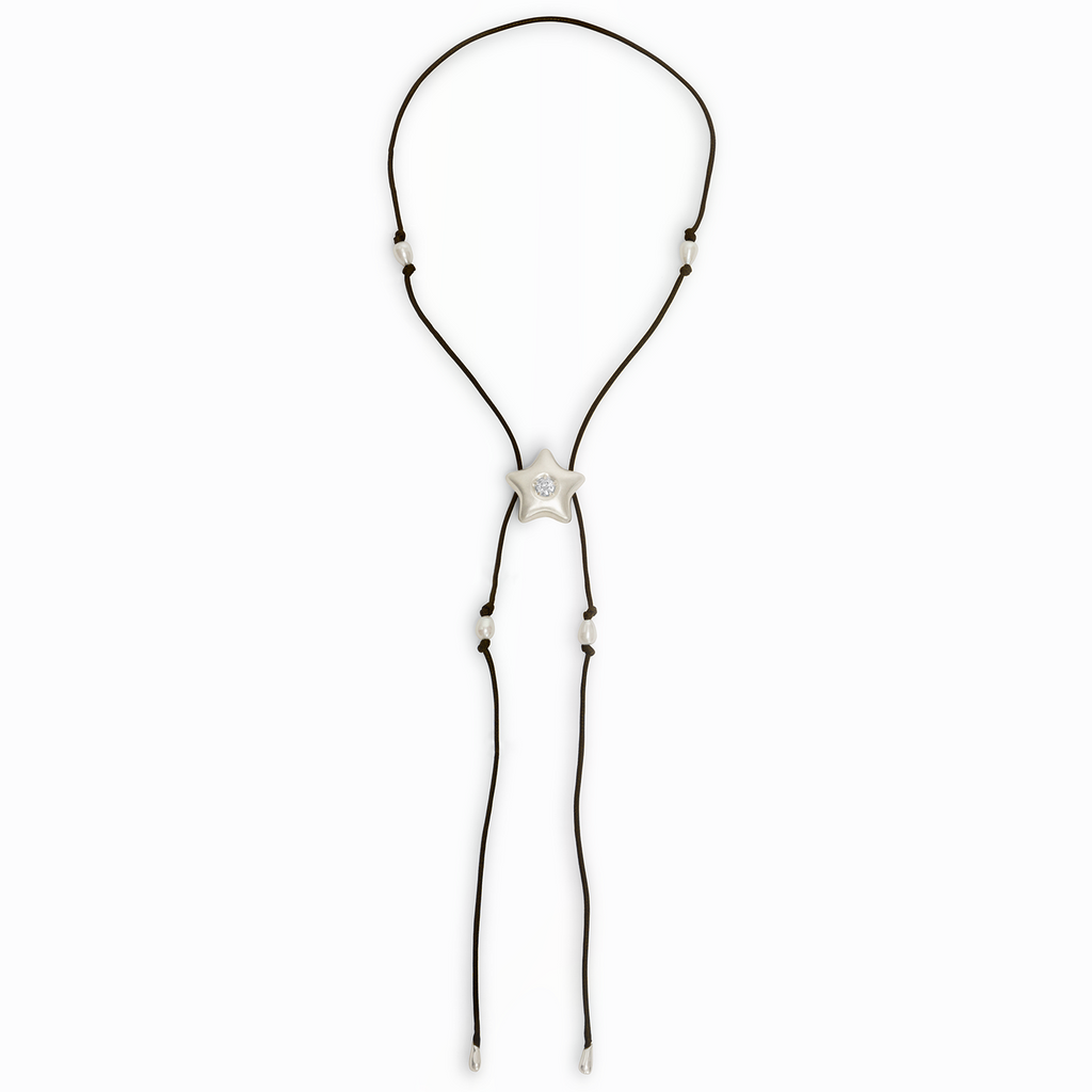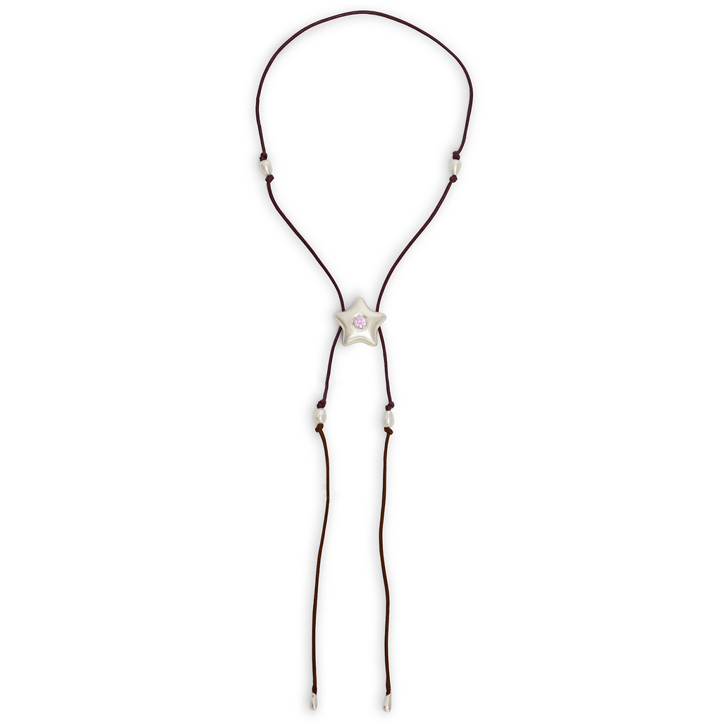 A brown cord necklace featuring a large puffy star with a round center stone.