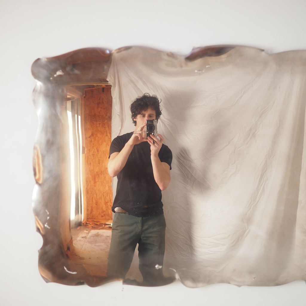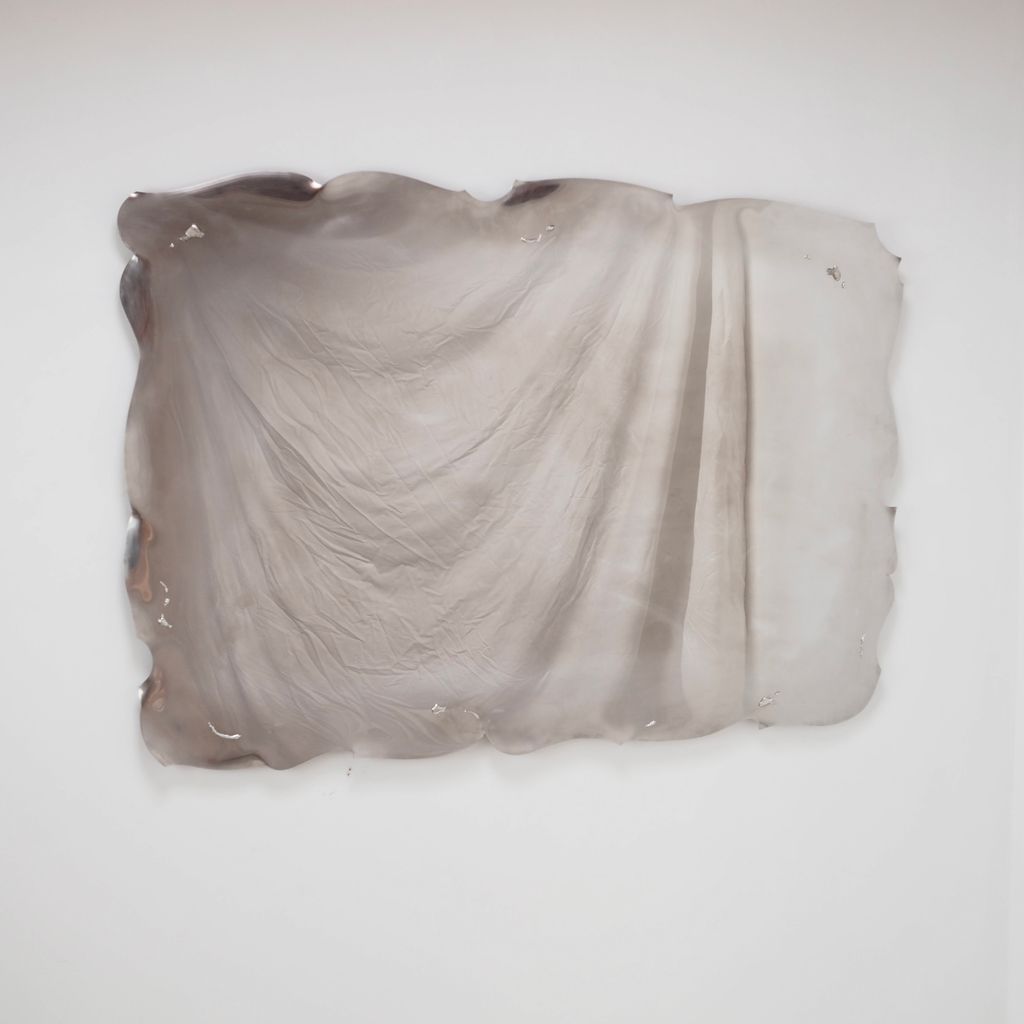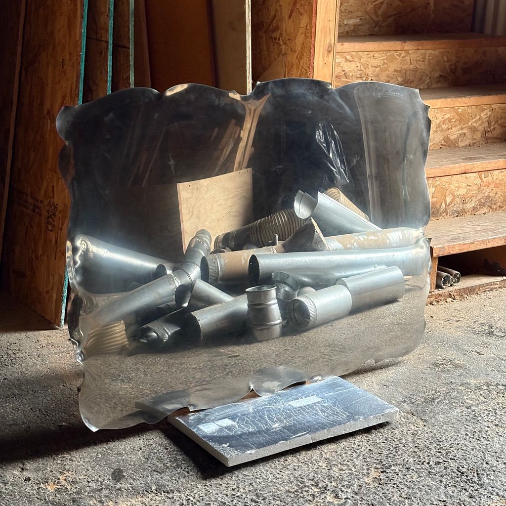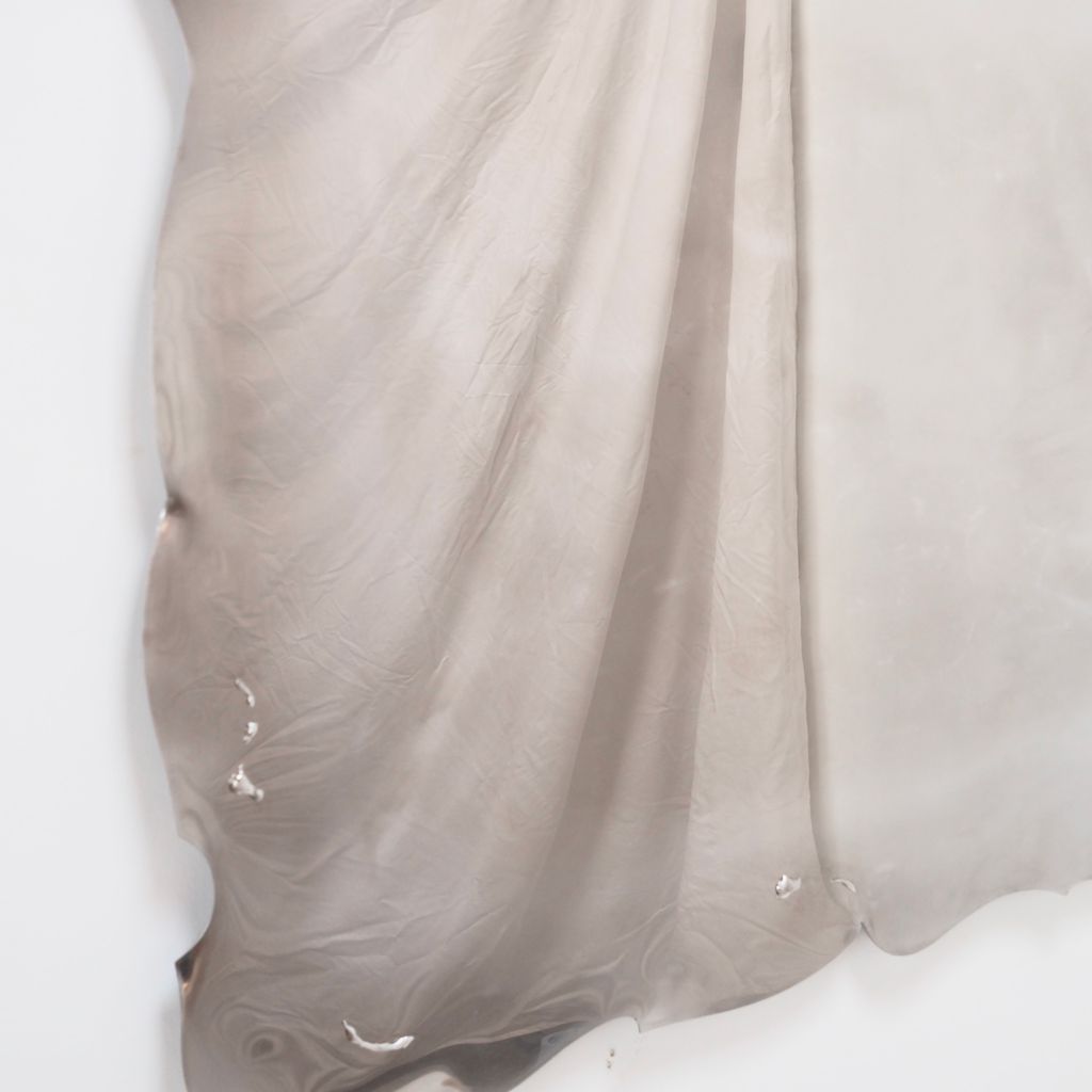 Polished stainless steel mirror with wavy edge detail and sculptural tin elements.