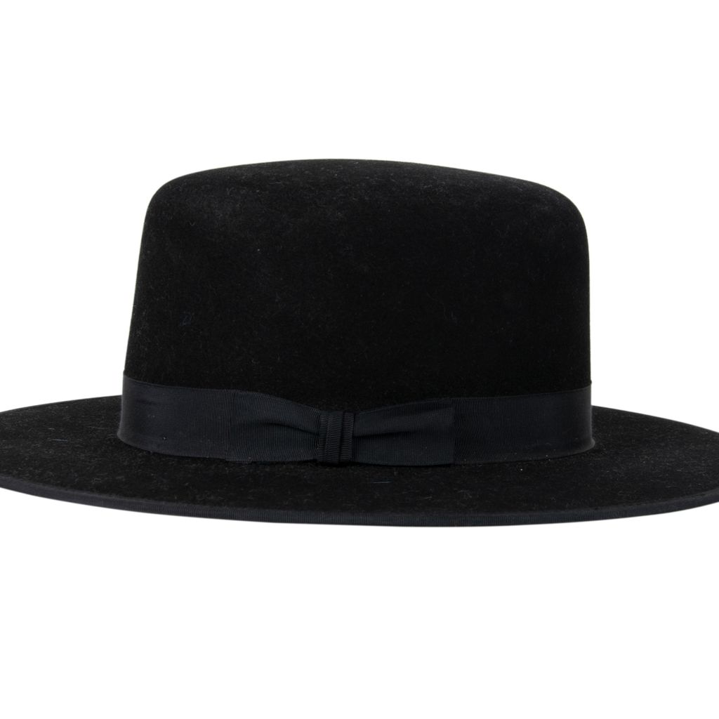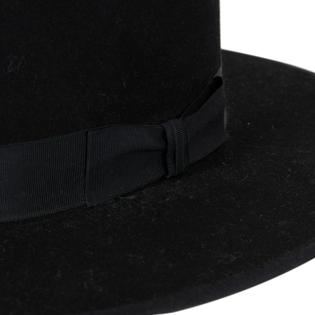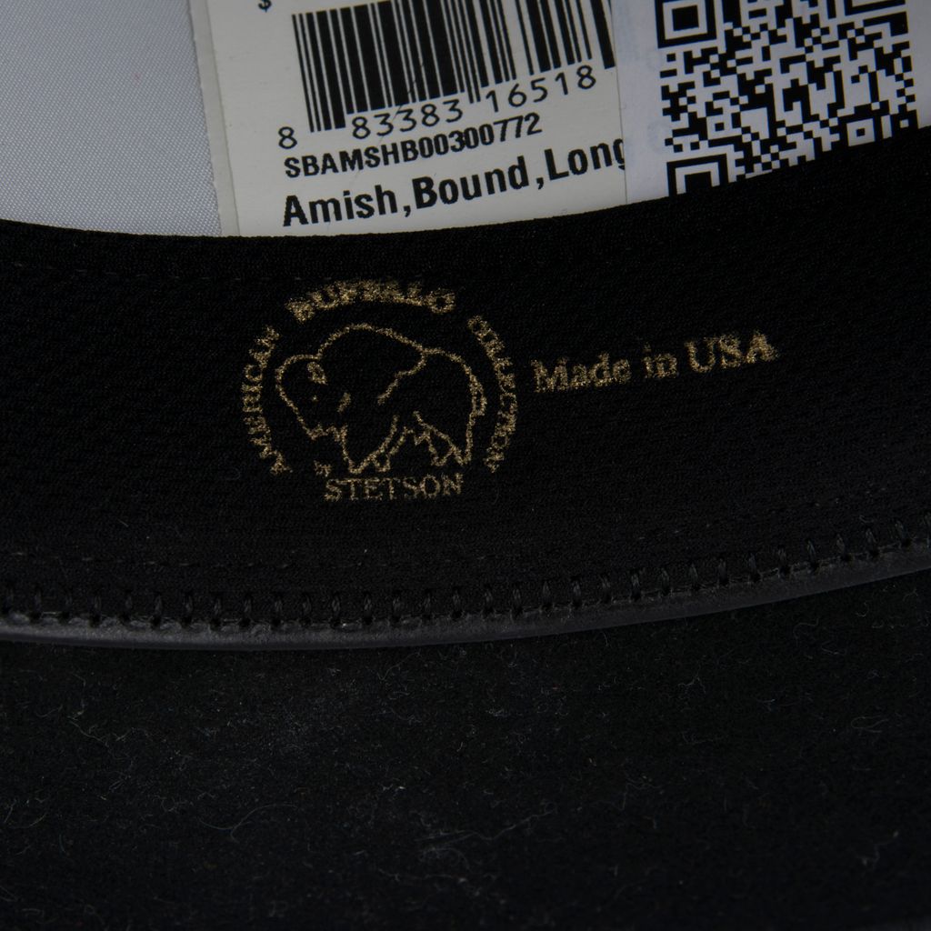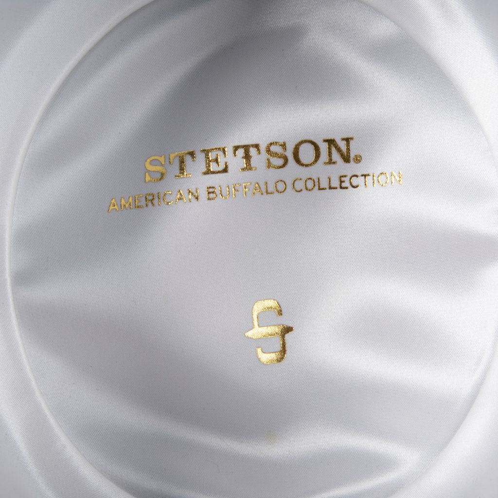 This structured fedora hat from Stetson's American Buffalo Collection features a long oval head shape, inner satin lining, grosgrain bow trim, has a rounded head silhouette, and wide brim. Brand new, tag attached on inside, in good condition.