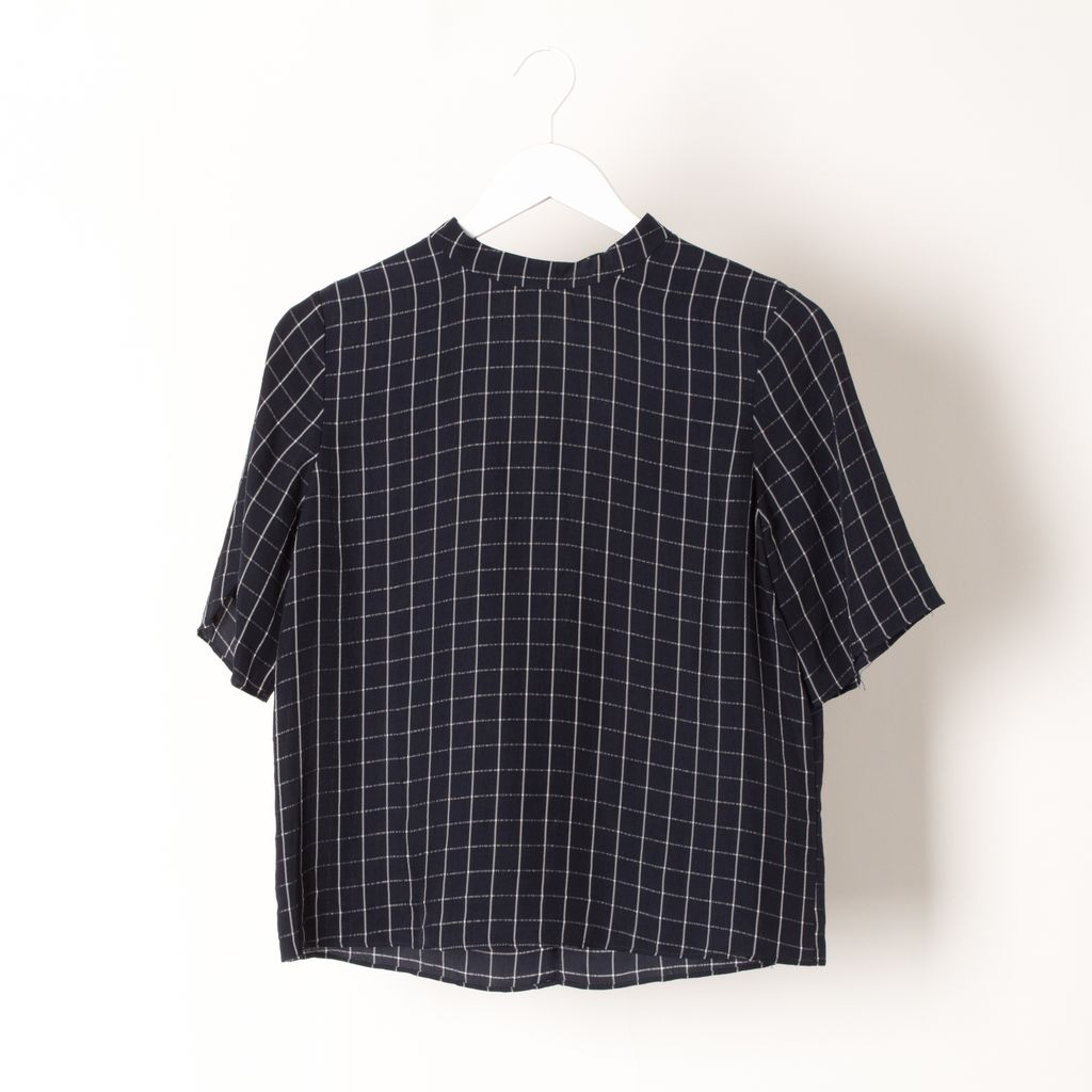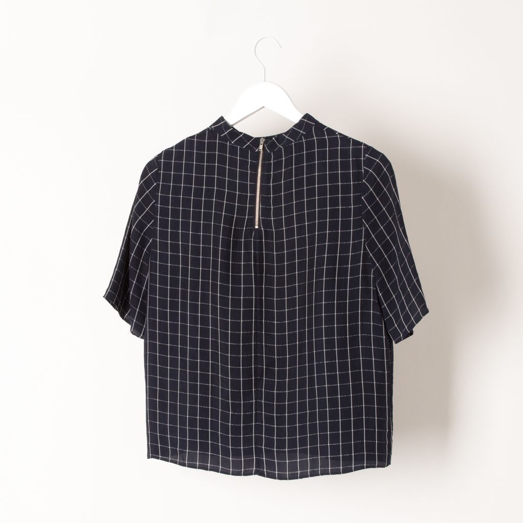 Gently worn windowpane patterned blouse from Steven Allen. Features a lightweight cupro fabric blend, raw round neckline, back zip neckline closure, a rounded hem and windowpane print pattern motif throughout.