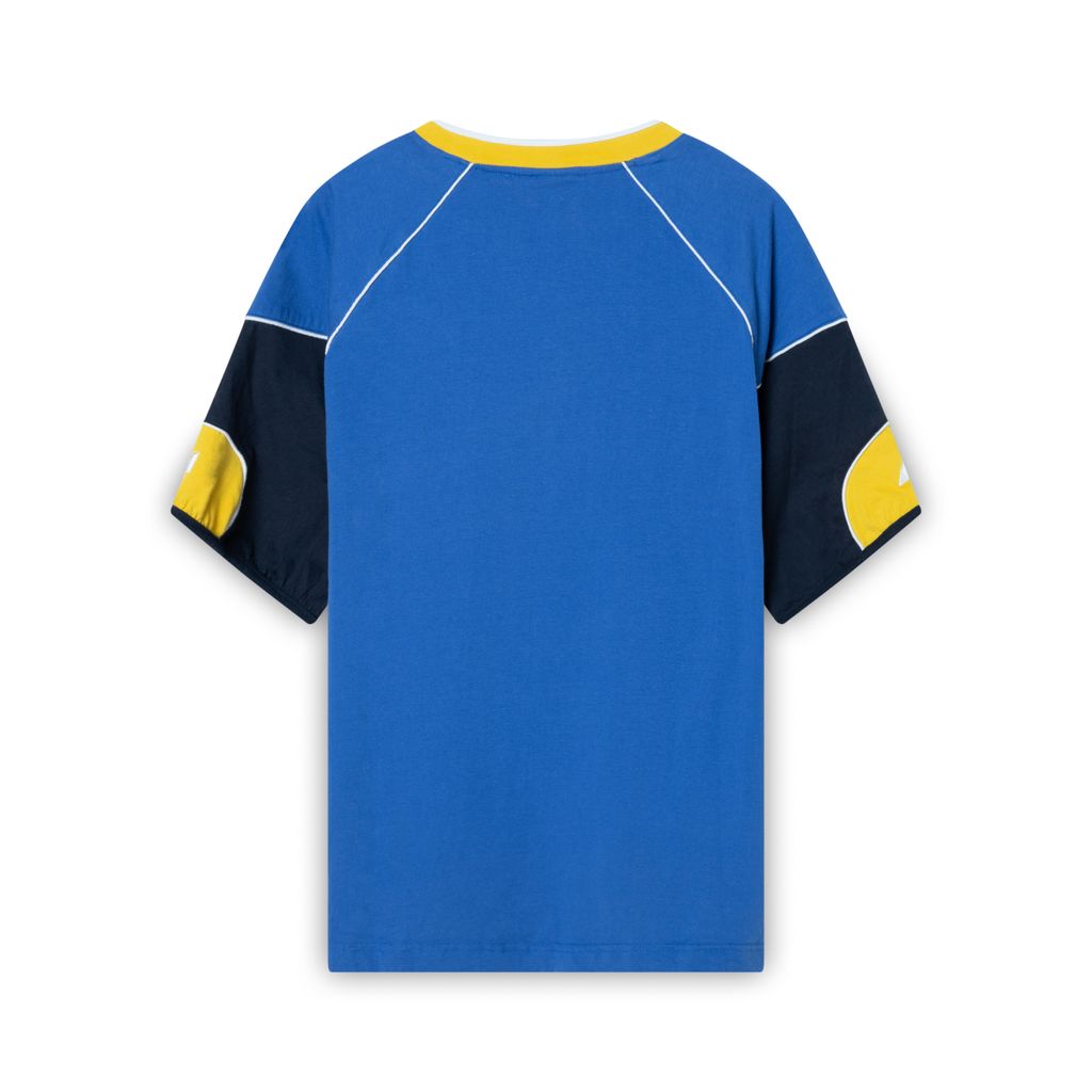 Stiga Blue and Yellow Tee features white lining and logo embroidery on center chest, left sleeve and bottom left.