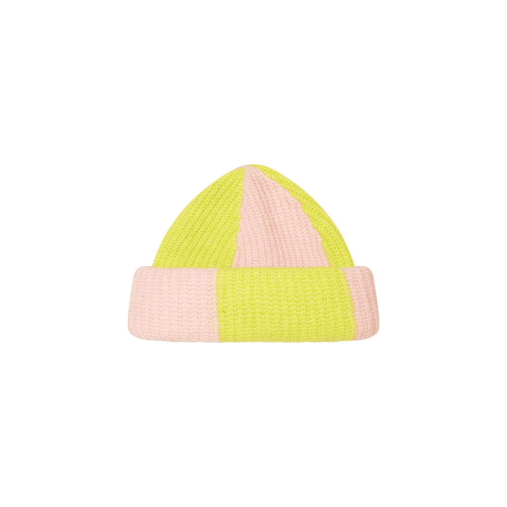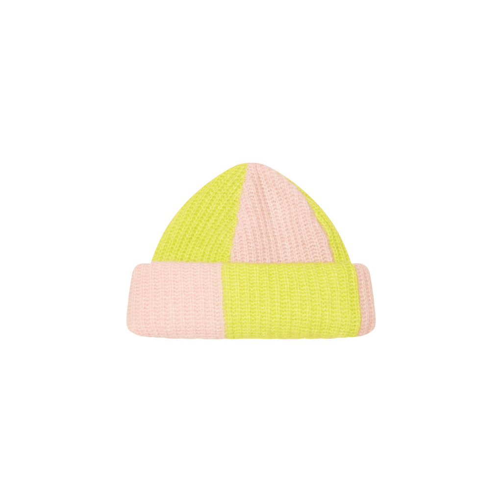 Stine Goya Cleo Beanie in Chartreuse/Light Pink features large cuffed brim and chartreuse and light pink color blocked pattern.