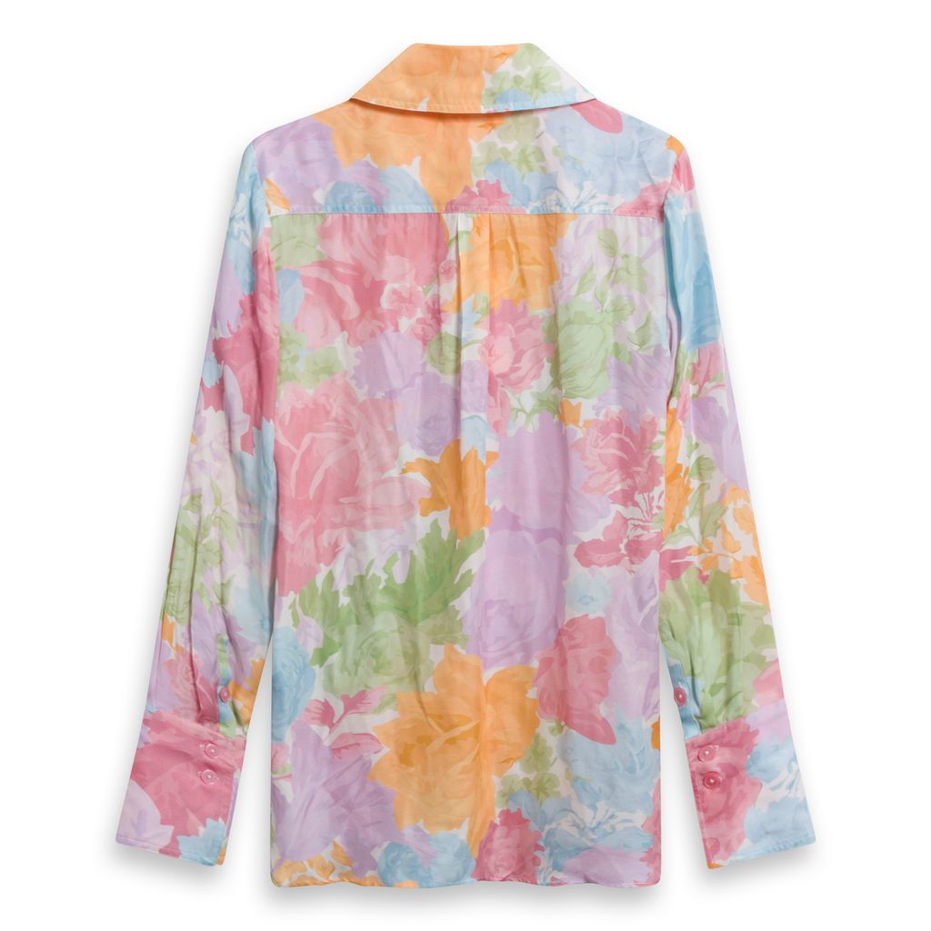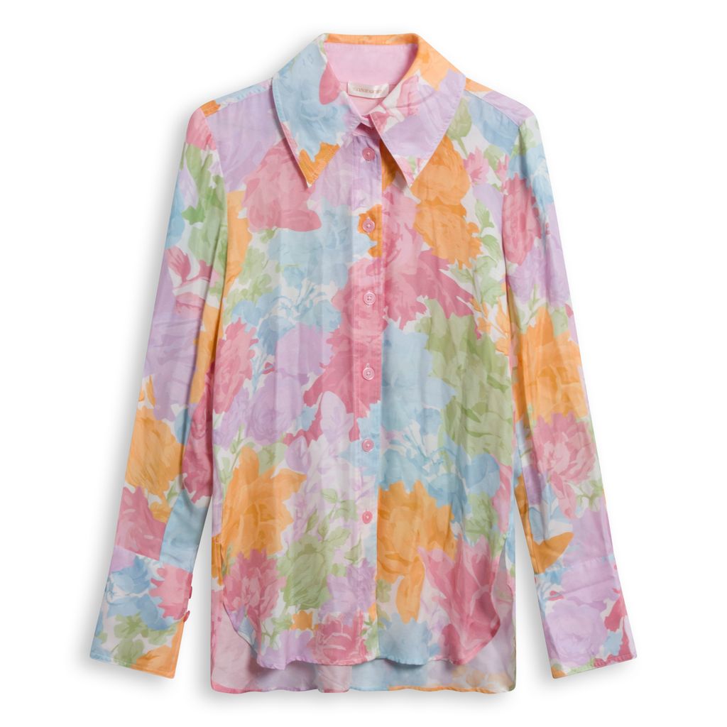 This modal/silk floral printed blouse by Stine Goya features oversized point collar and elongated sleeves. Includes button front closures, side slits and back box pleat. Brand new with tags.