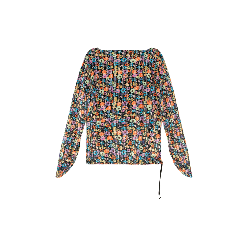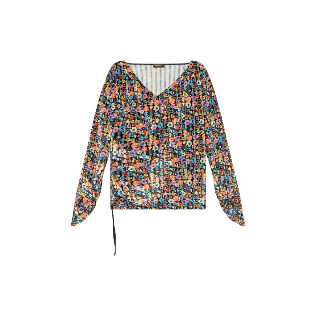 Stine Goya Multicolored Floral Velvet Top features wrap V-neck, velvet and mesh ribbed detailing, multicolored floral pattern, and ruching at right side and sleeves.