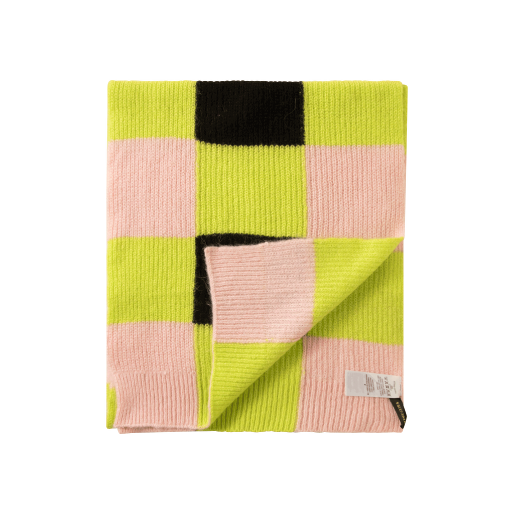 Stine Goya Orphea Scarf in Pink/Green Check features oversized rectangular shape, ribbed hem, and large checks in chartreuse, black, and light pink.