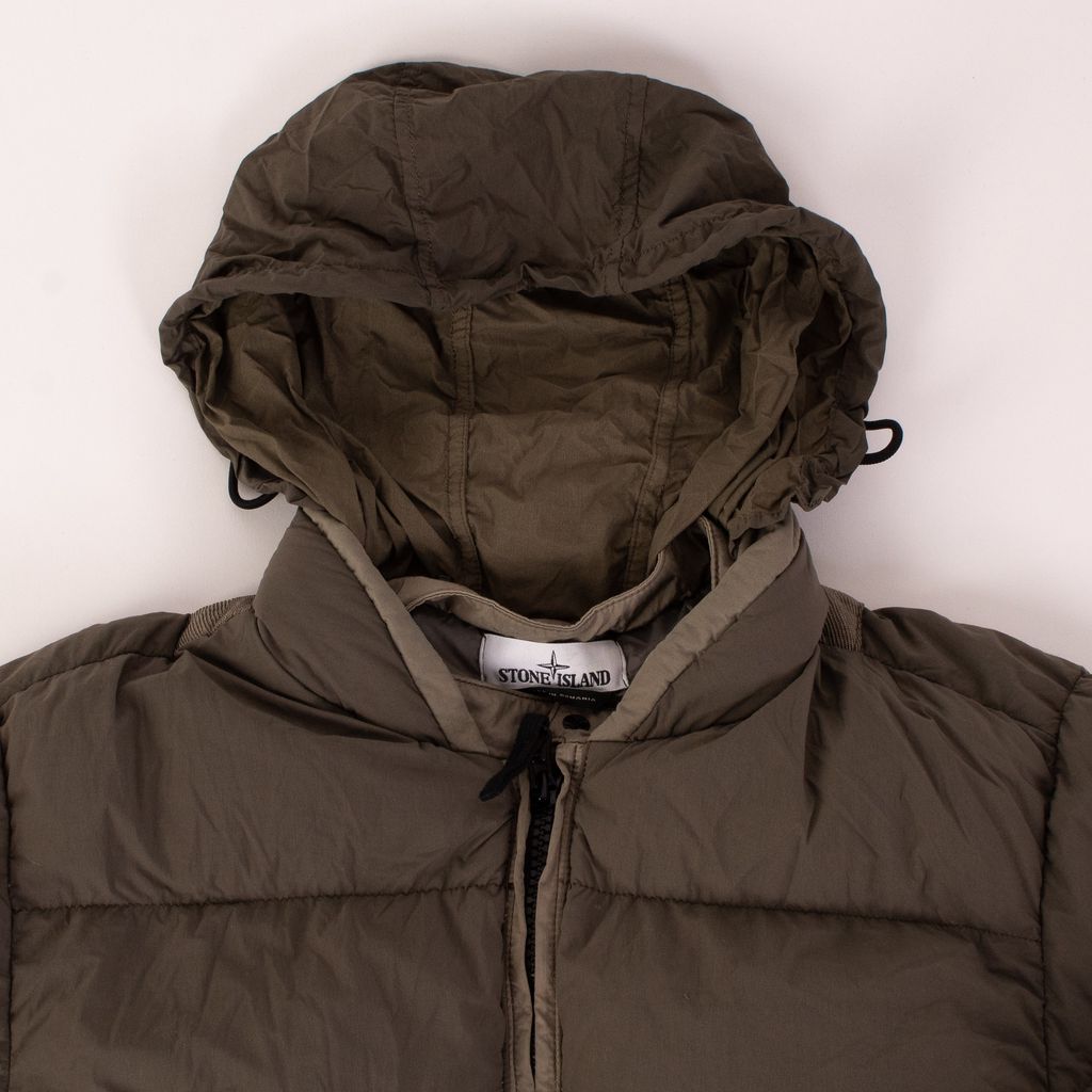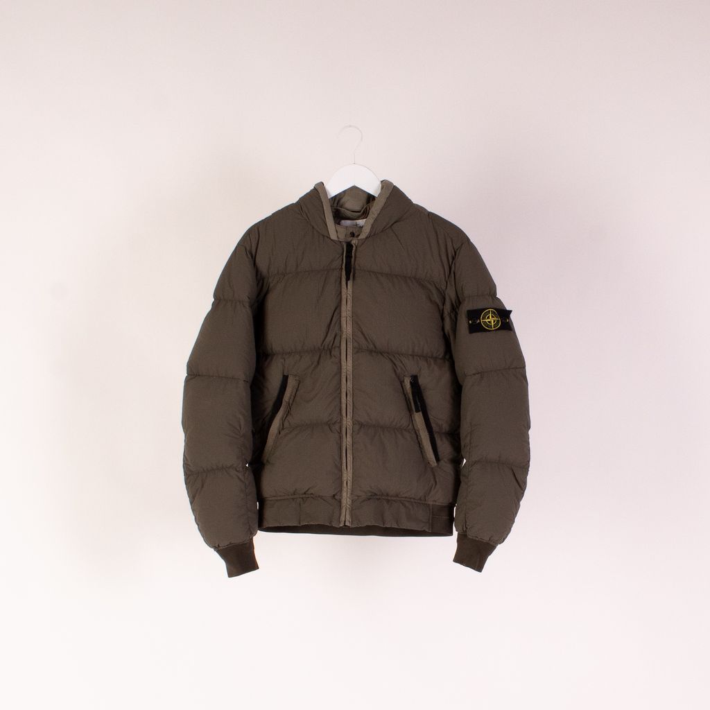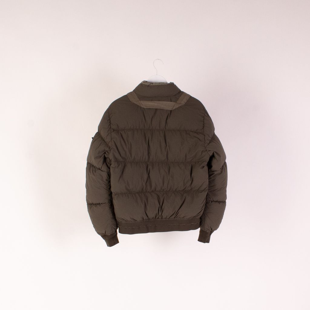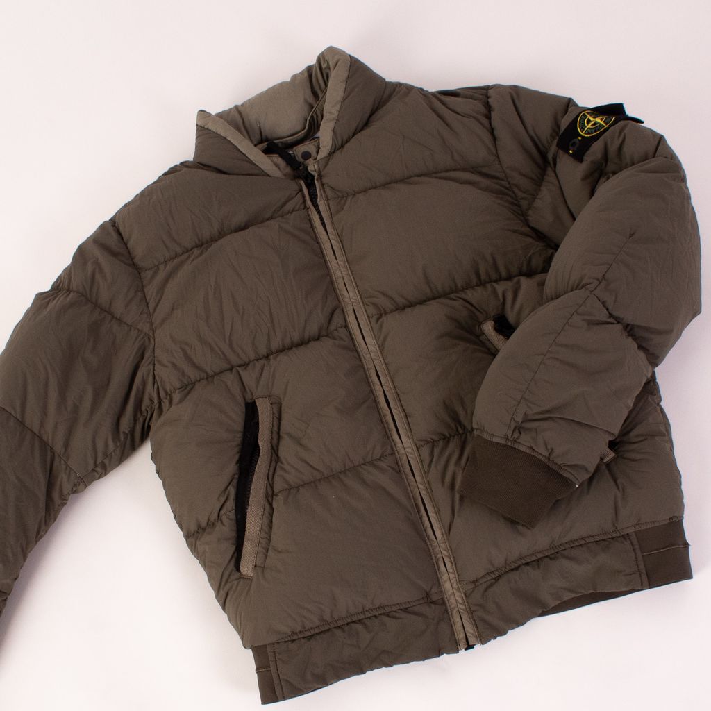 Keep cozy in this luxury puffer with a utilitarian twist from Stone Island. Features logo patch on arm, full zip front closure, front pockets, and rib knit detail waist band and cuffs.