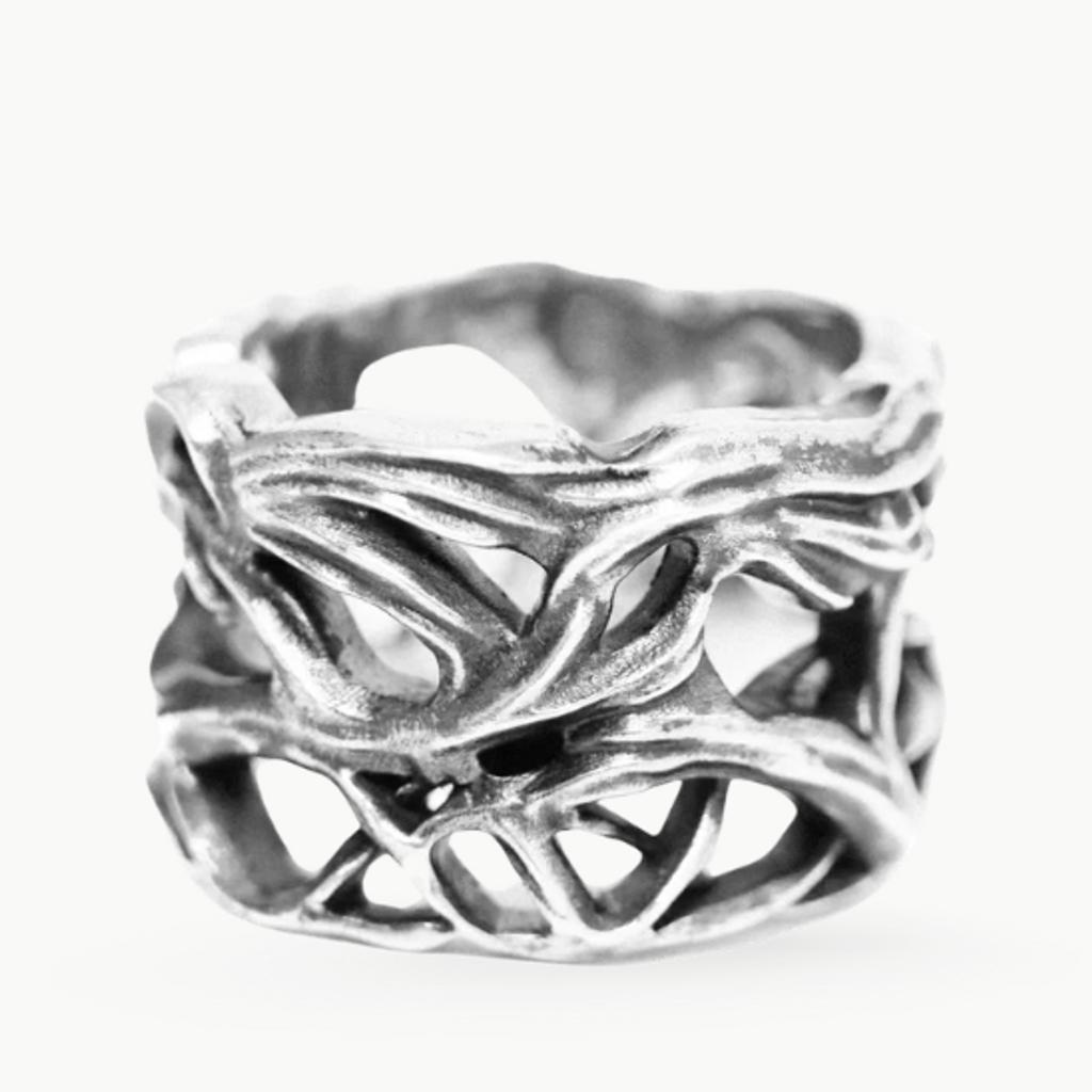 A tangle of ancient vines encircles the finger. A very heavy, chunky ring of solid Sterling Silver.