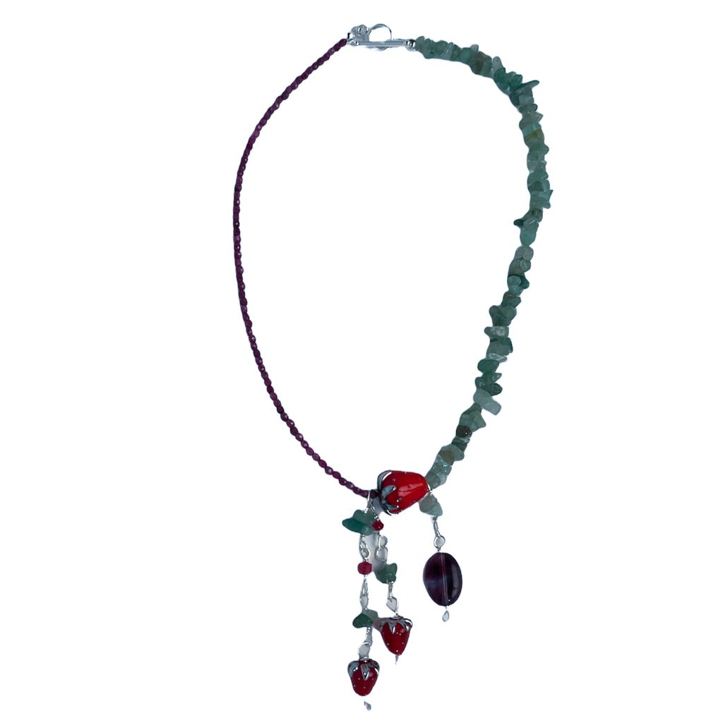 Strawberry Field Necklace features rubies, handmade glass strawberries, fluorite, and lepidocrocite with 925 silver hardware.