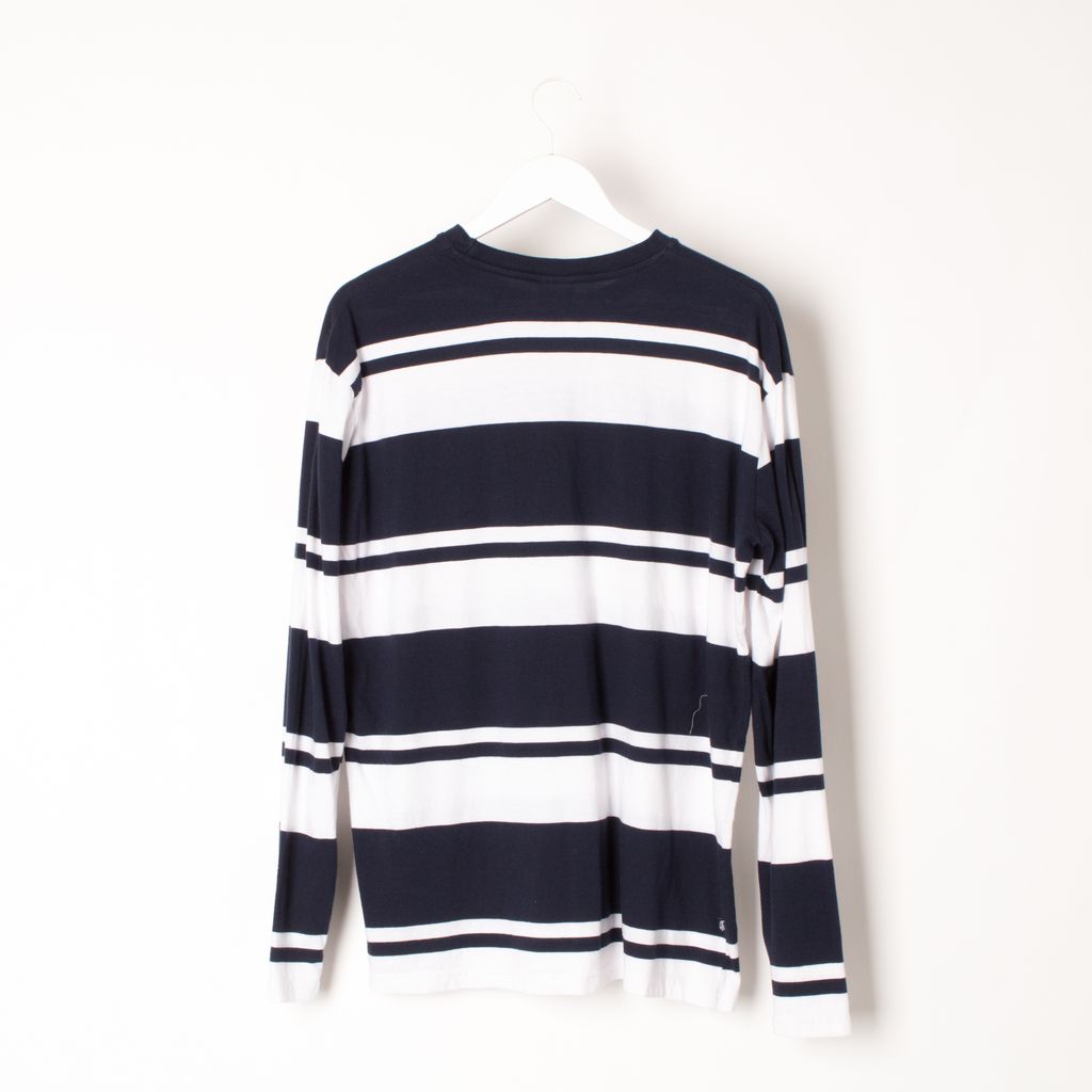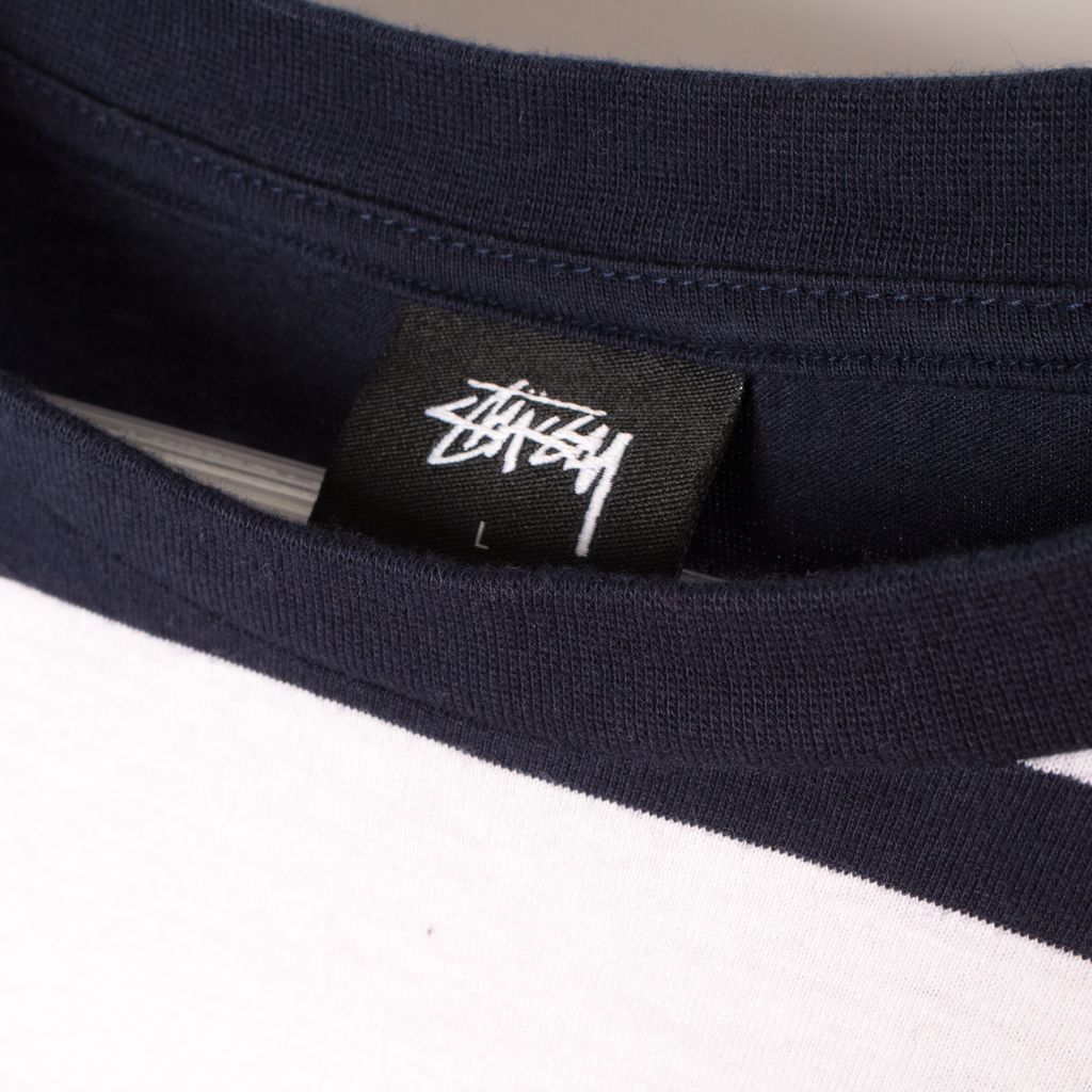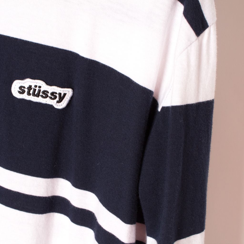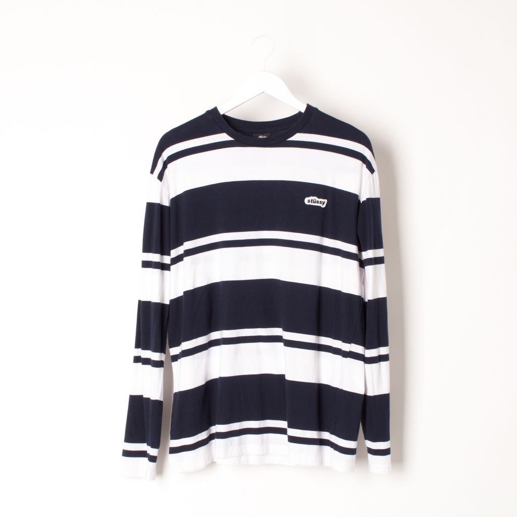 Longsleeve retro Stussy tee, pre-owned, navy and white stripes with embroidered chest graphic.