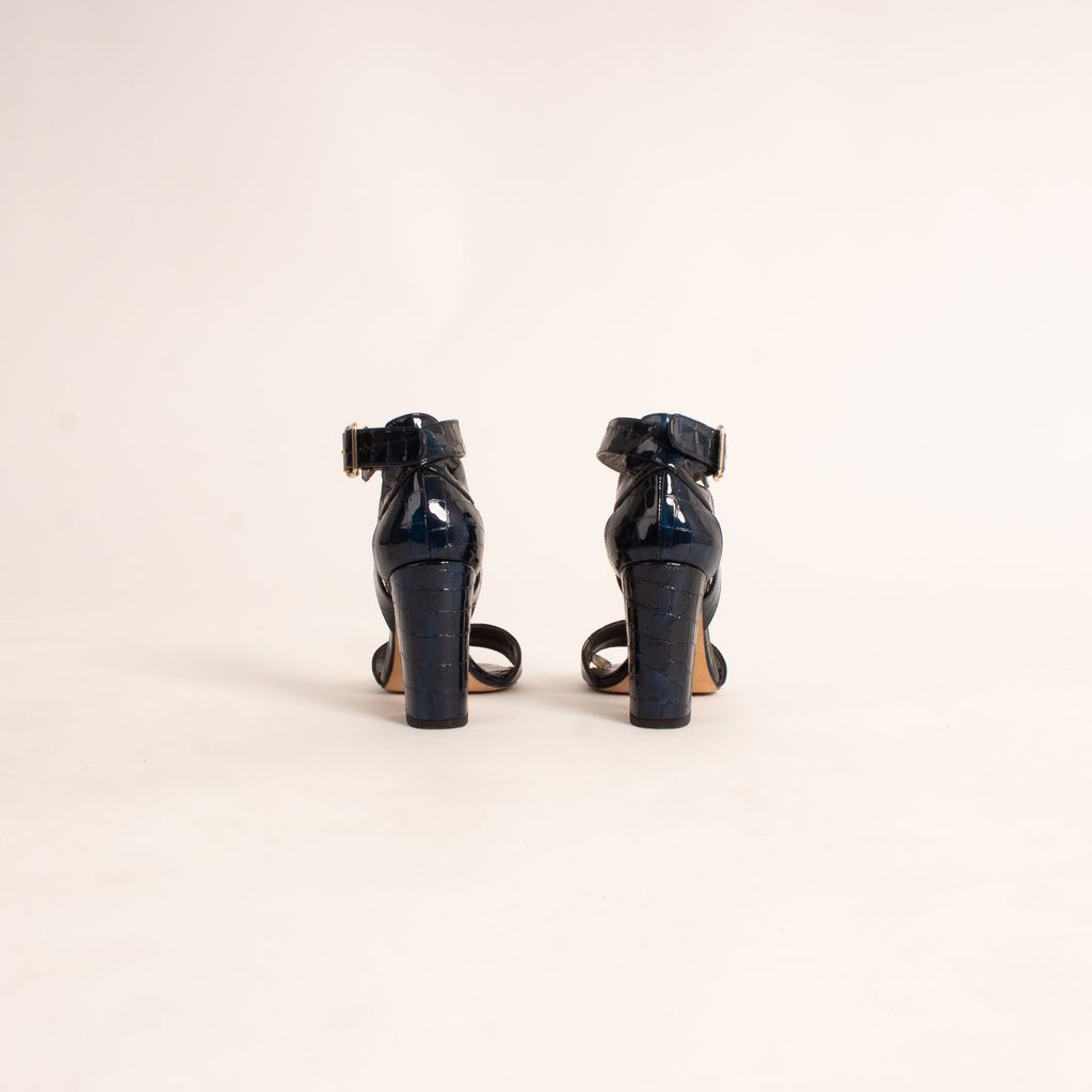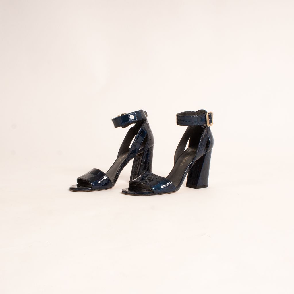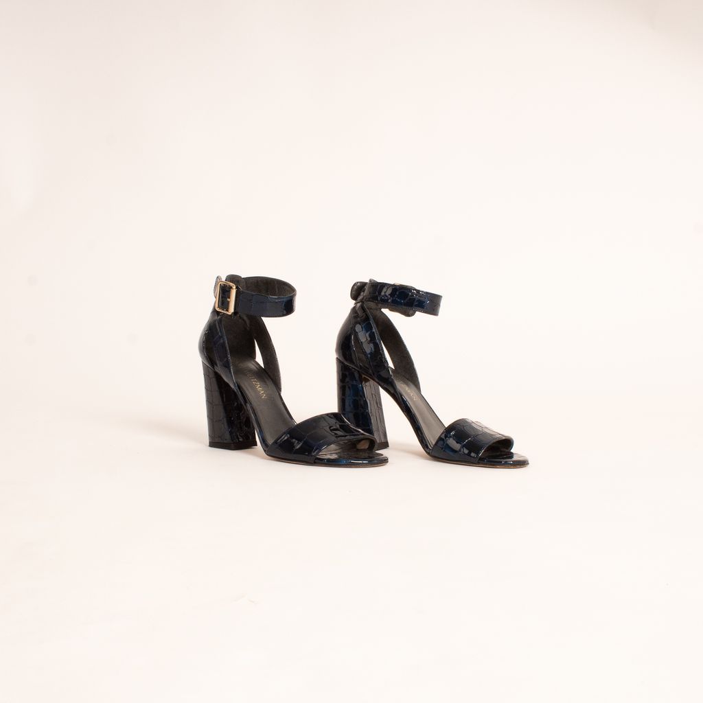 Stuart Weitzman never disappoints, especially not with these embossed leather shoes that give any outfit a jolt of adrenaline. Features electric blue and crocodile embossed leather fabrication, open toe design, and adjustable ankle strap.