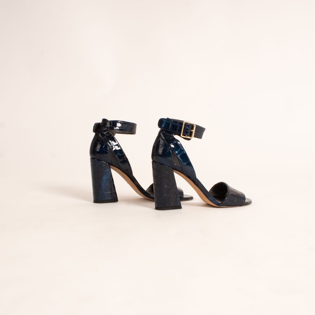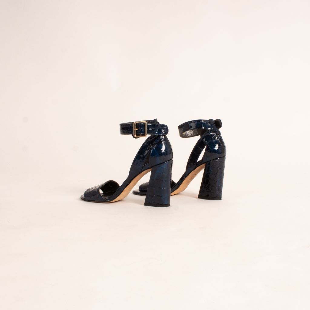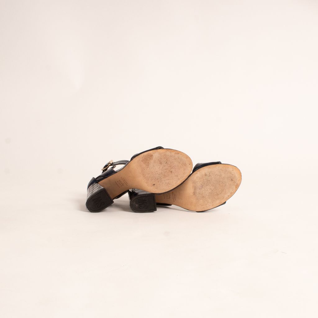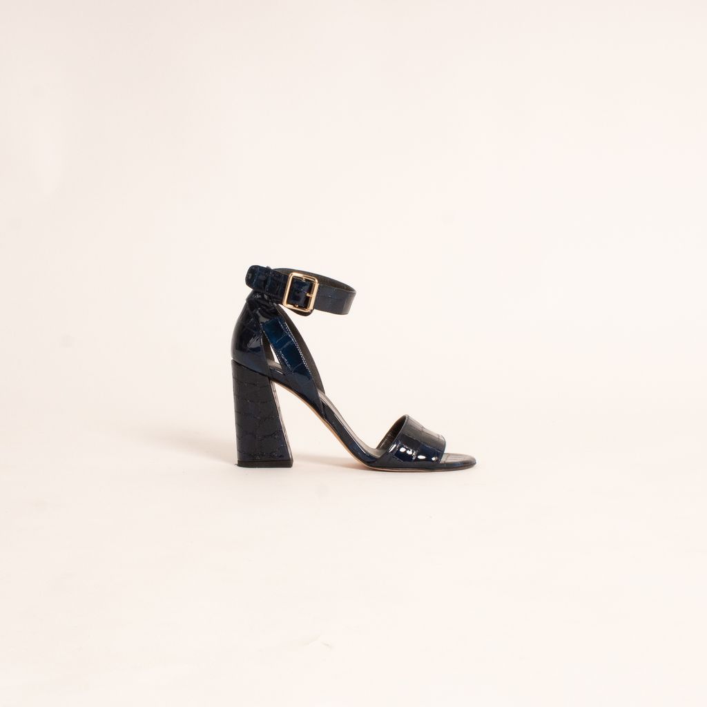 Stuart Weitzman never disappoints, especially not with these embossed leather shoes that give any outfit a jolt of adrenaline. Features electric blue and crocodile embossed leather fabrication, open toe design, and adjustable ankle strap.