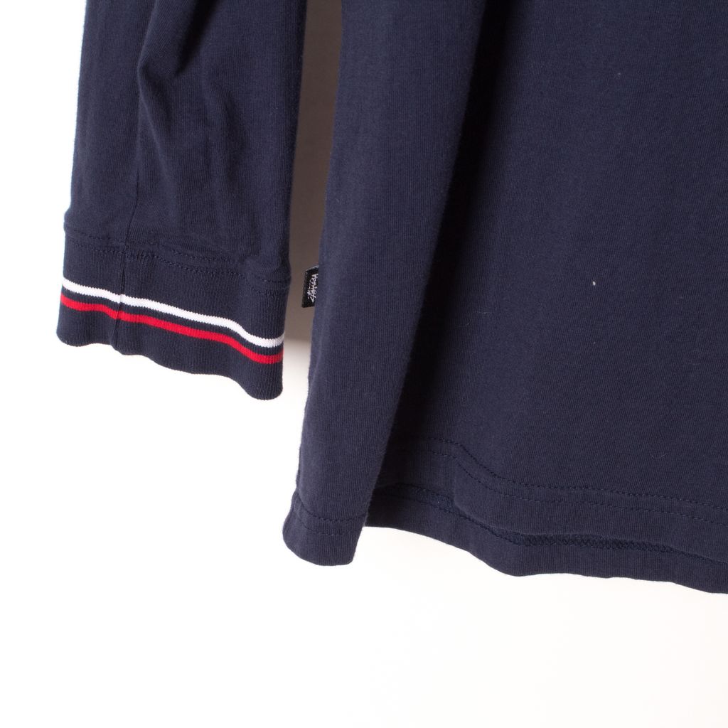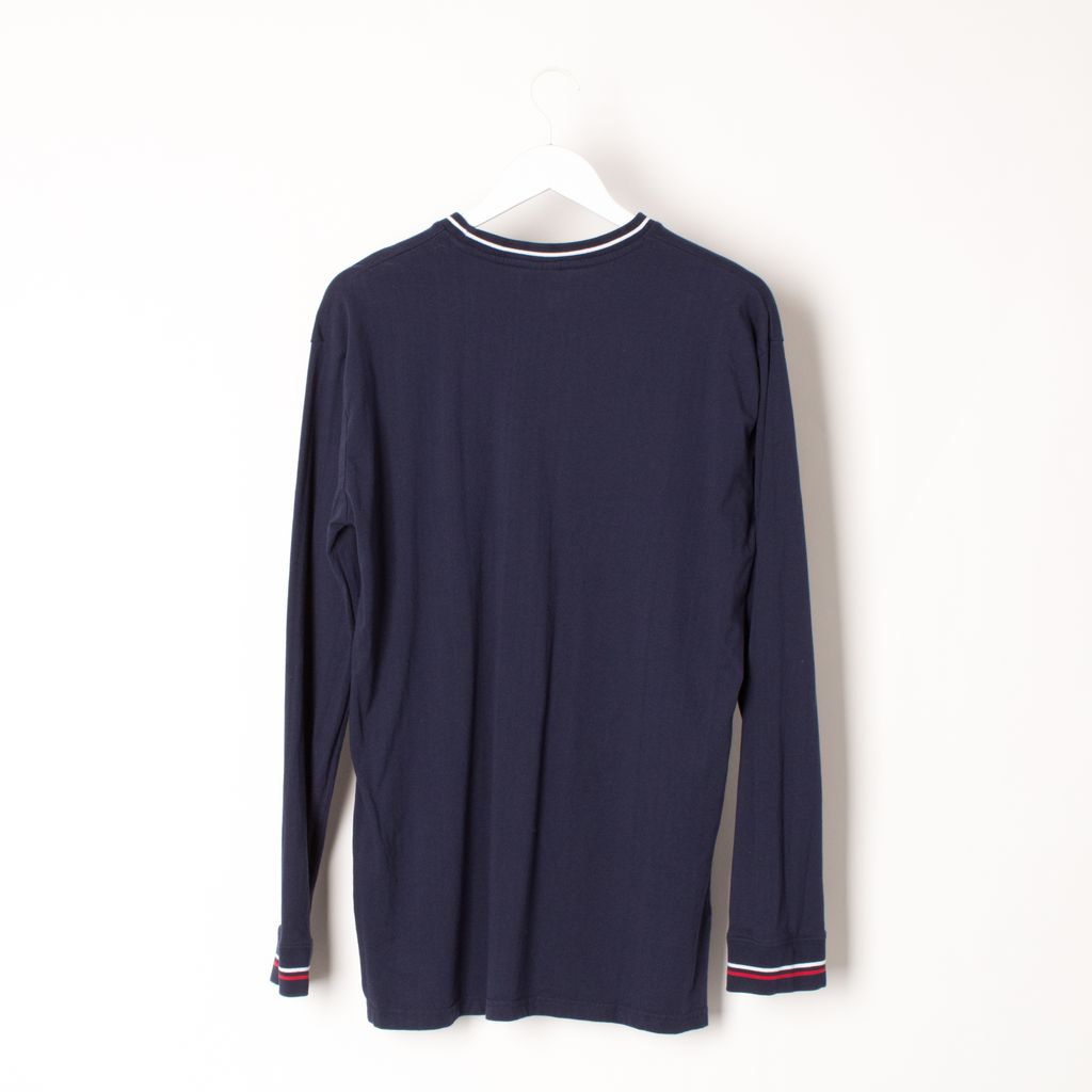 Navy long sleeve with red white and blue detail on ribbing of sleeves and neck.