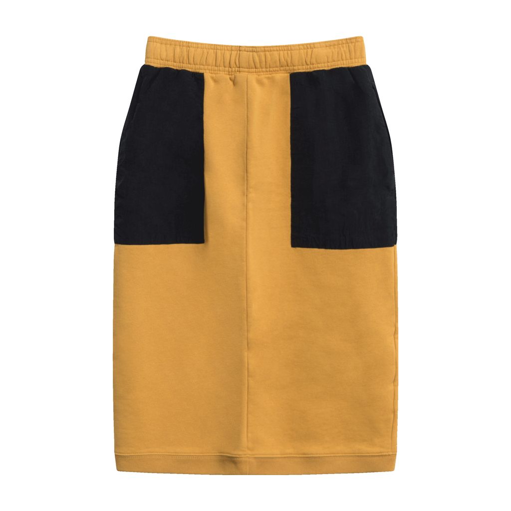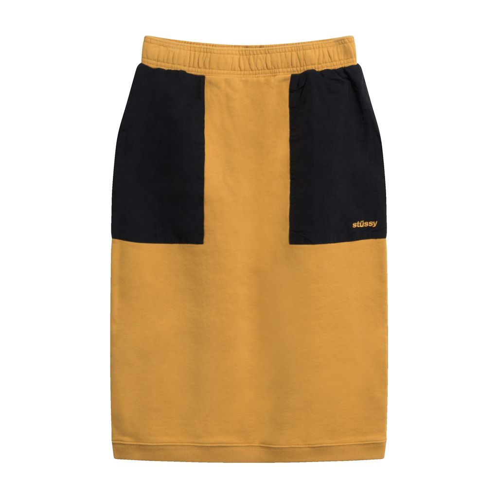 This contrast colored skirt from Stussy is a crazy mashup of a feminine silhouette and casual construction for a hyper cool piece. Pair with the matching sweater for a full look. Features elastic waistband, high waisted pencil skirt silhouette, contrast colored pockets with Stussy logo, and back seam.