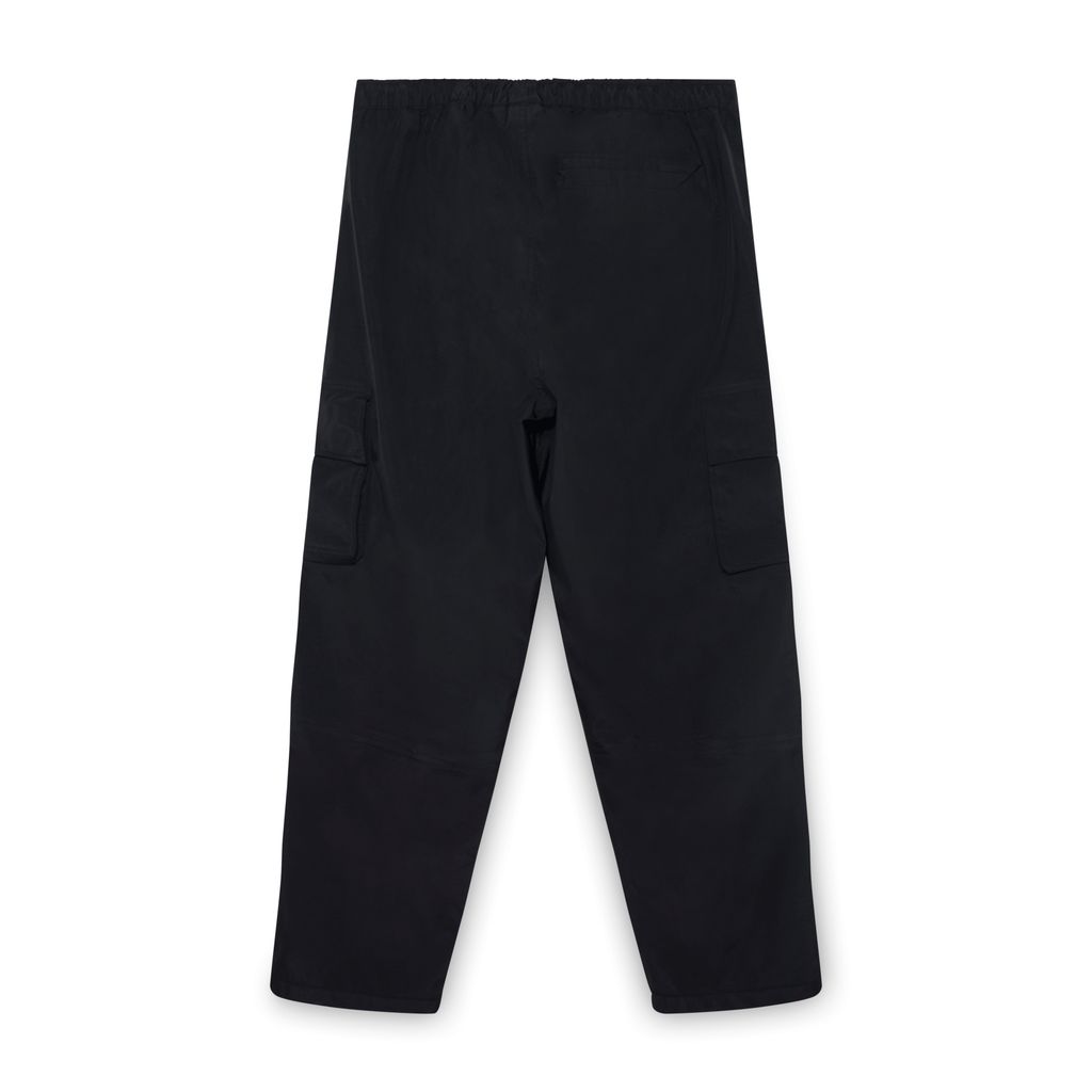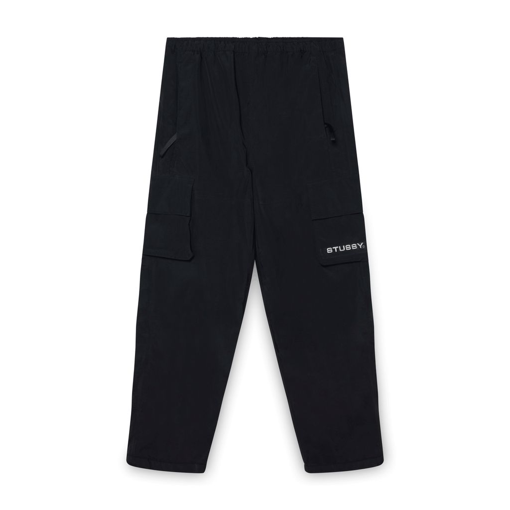 Stussy Solid Taped Seam Cargo Pant features elastic waist, Stussy Design Corp flag label, and multiple side pockets.