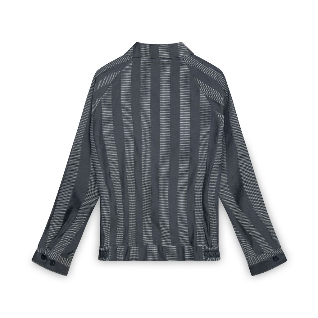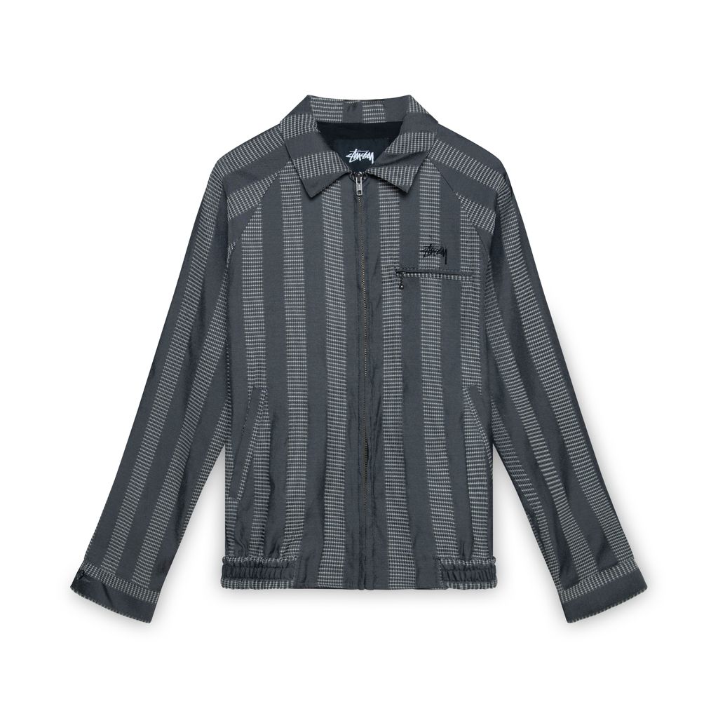Stussy Striped Workwear Jacket features front zip closure, chest pocket and logo embroidery, 2 side pockets, and elasticated cuffs and waistband.