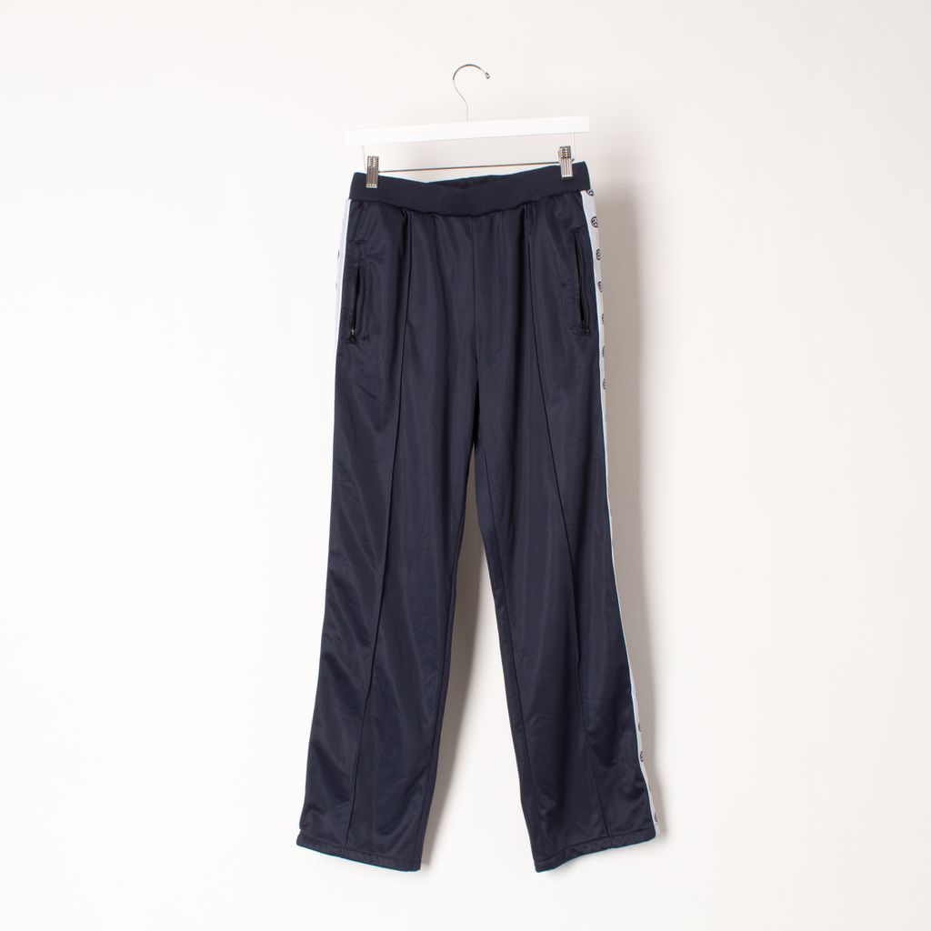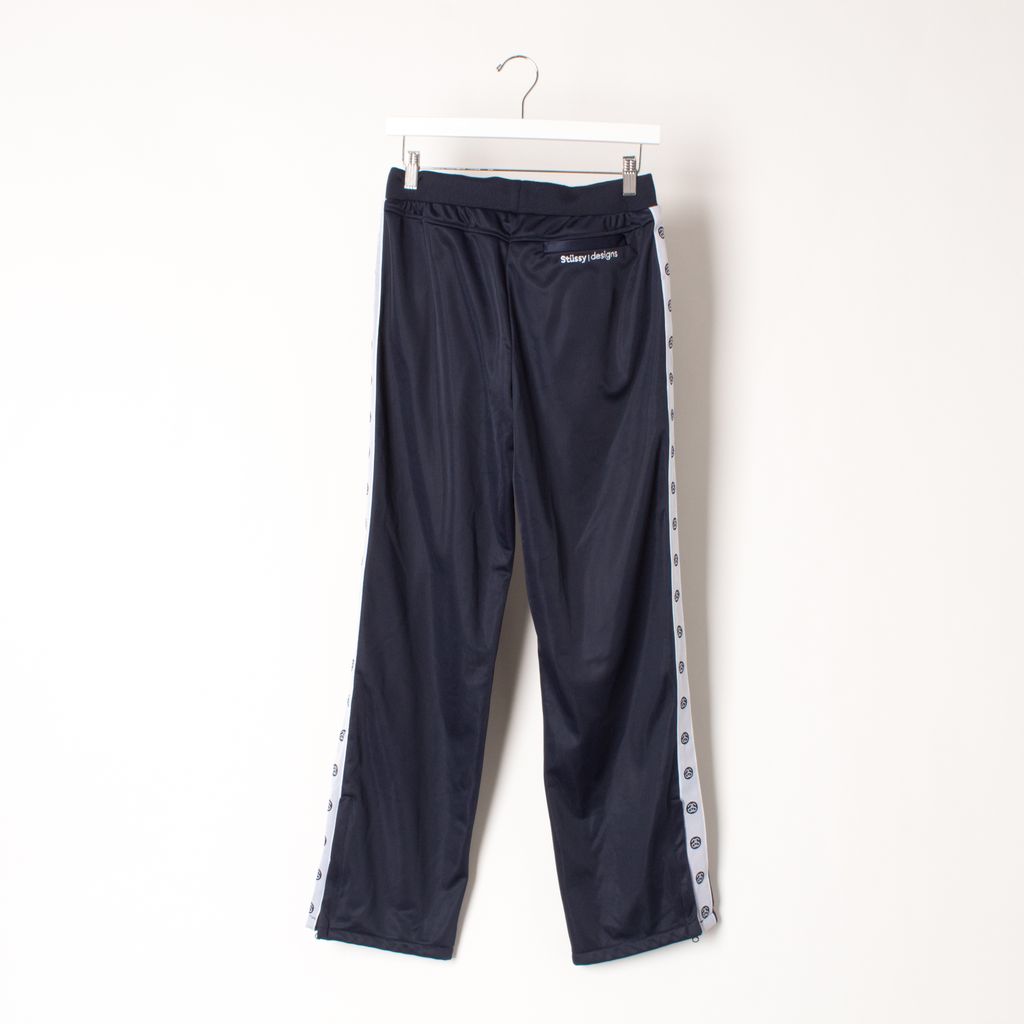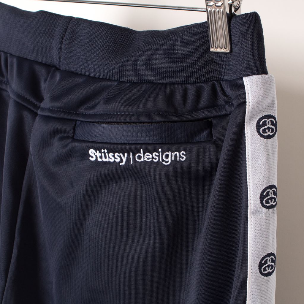 Brand new with tags, navy, stretch material featuring stretch waist band 2 side and 1 back zip pockets and Stussy branded taping down legs.