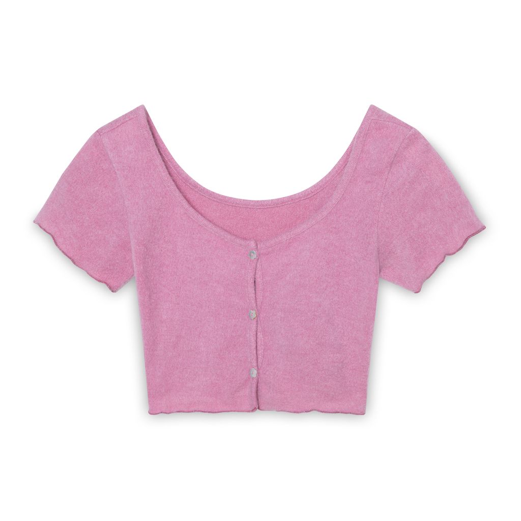 Sundae School Yuzu Flower Button Up features floral buttons, cap sleeve top, and scoop neckline.
