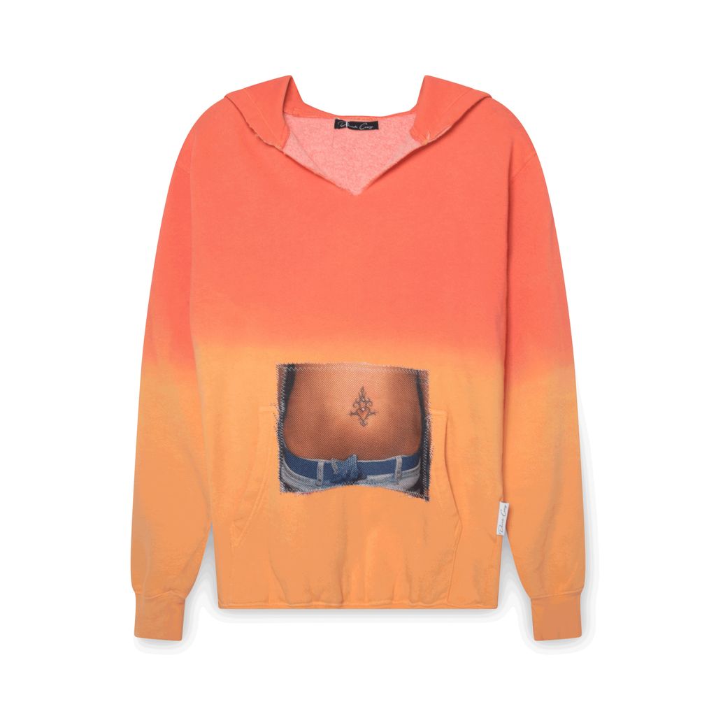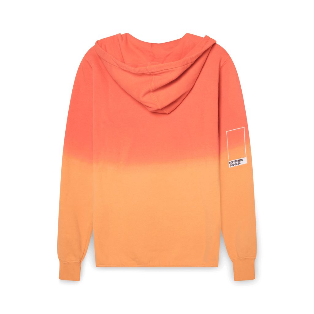 Sunset Hoodie features an ombre orange coloring with a decorative patch on the front pocket.