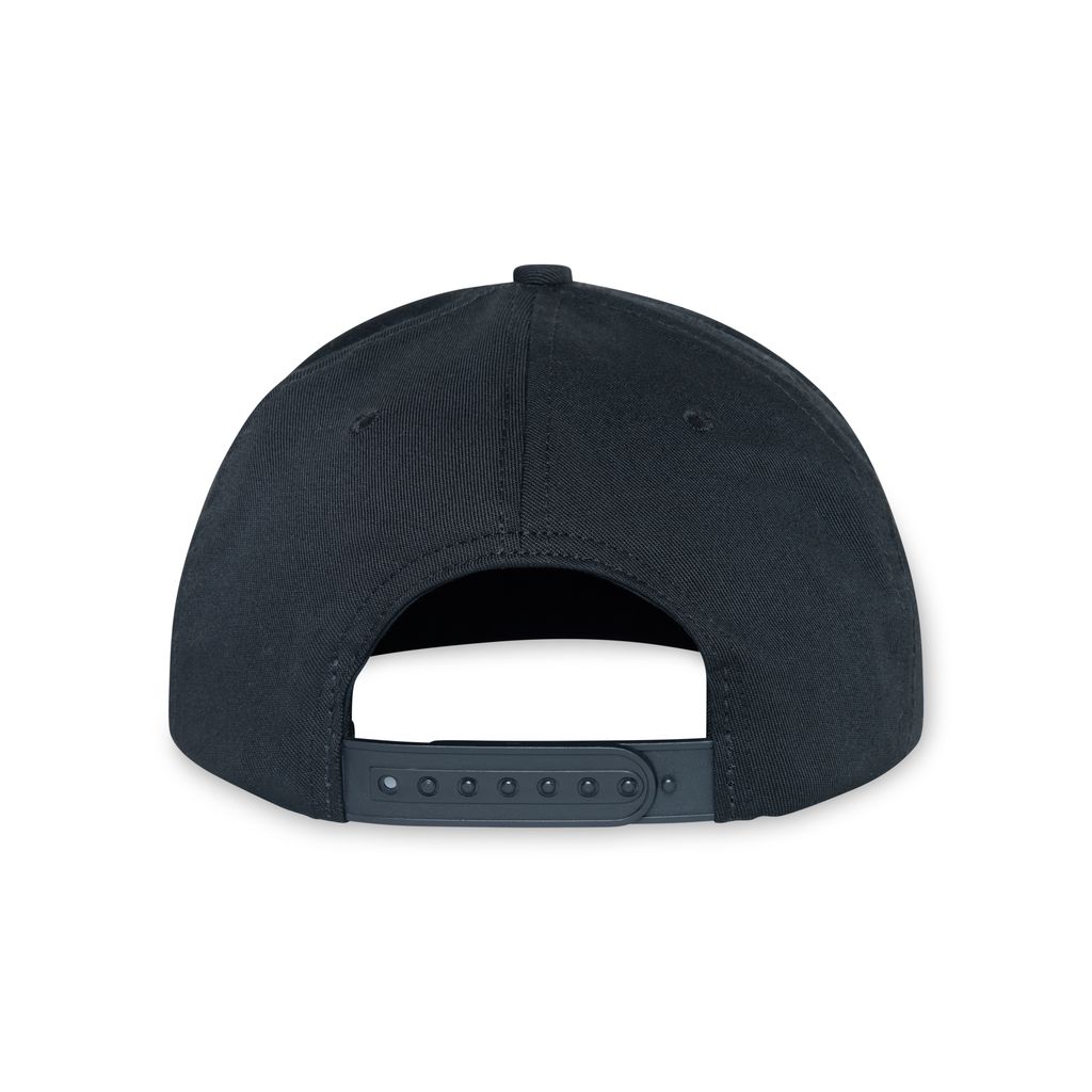 A black canvas hat with a mid crown and metallic embroidery. One size fits most; underbrim is light grey; snapback closure