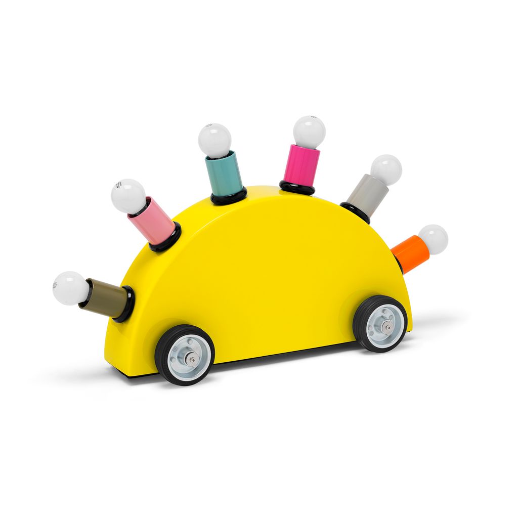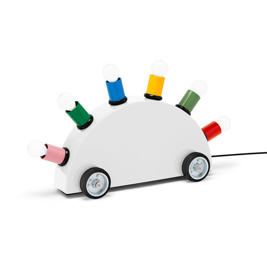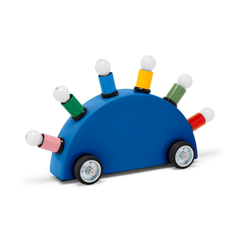 Designed in 1981 by Martine Bedin, the Super table lamp immediately became one of the most emblematic Memphis icons. The Super lamp can be dragged along like a dog on a leash (with an arched back resembling a stegosaurus), embodying the playful spirit of Memphis.
