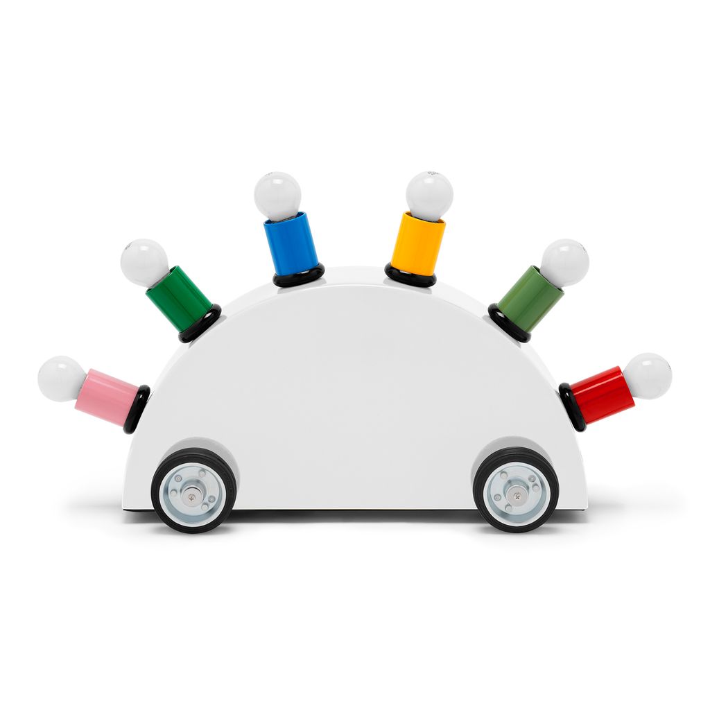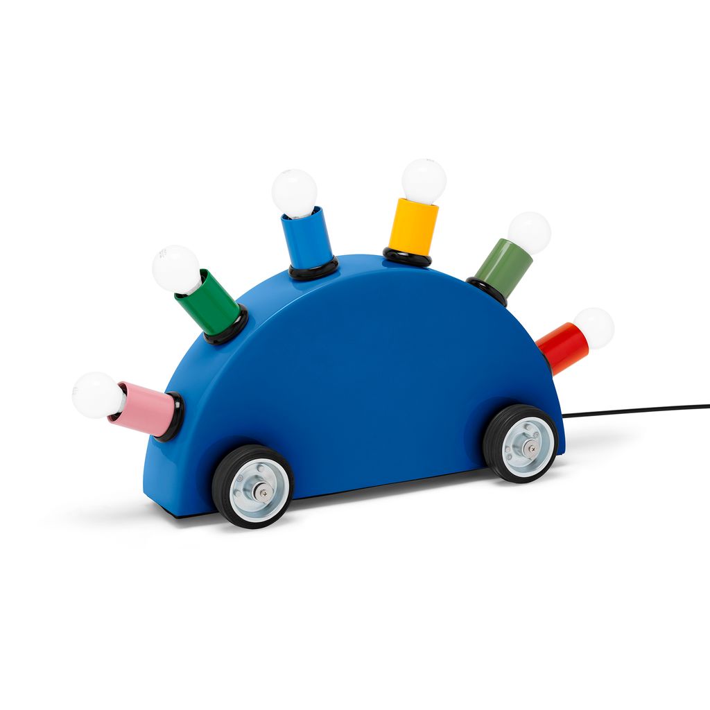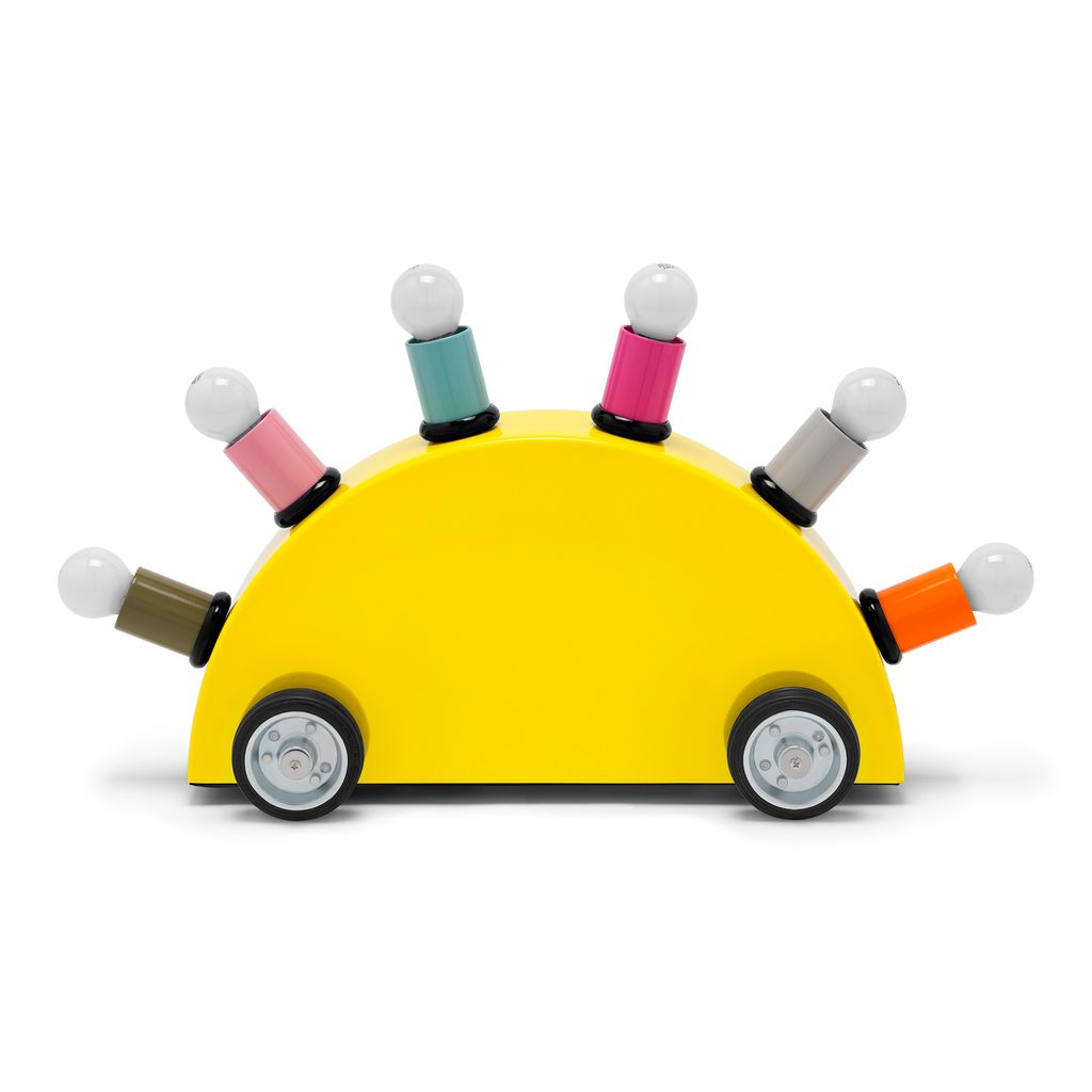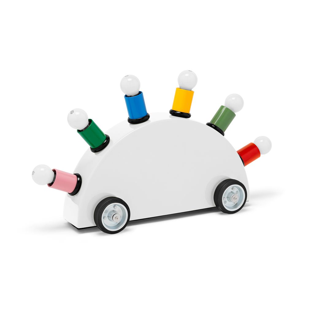 Designed in 1981 by Martine Bedin, the Super table lamp immediately became one of the most emblematic Memphis icons. The Super lamp can be dragged along like a dog on a leash (with an arched back resembling a stegosaurus), embodying the playful spirit of Memphis.