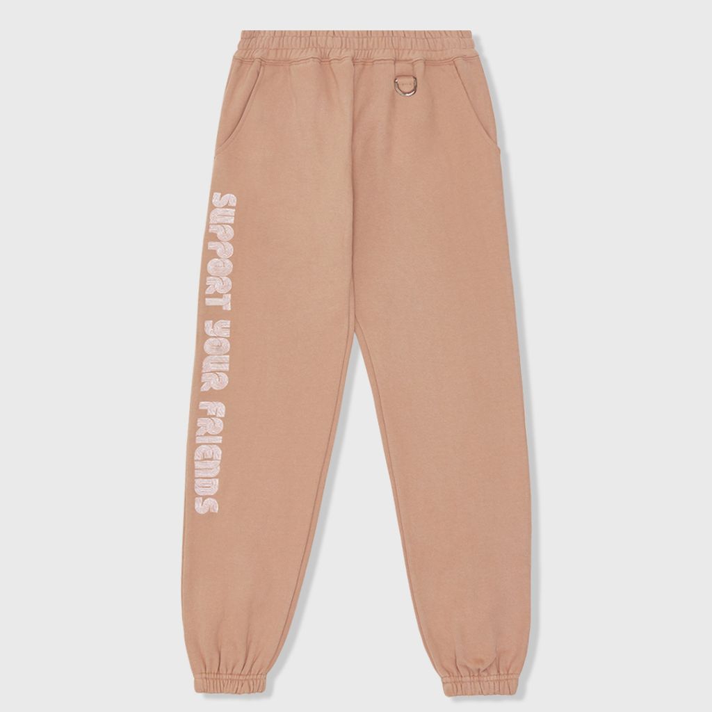 Matching the brown Support Your Friends QTZIP, these adorable sweatpants feature "Support Your Friends" text in white on the right leg, an elastic waistband, and a functional pocket on the backside.