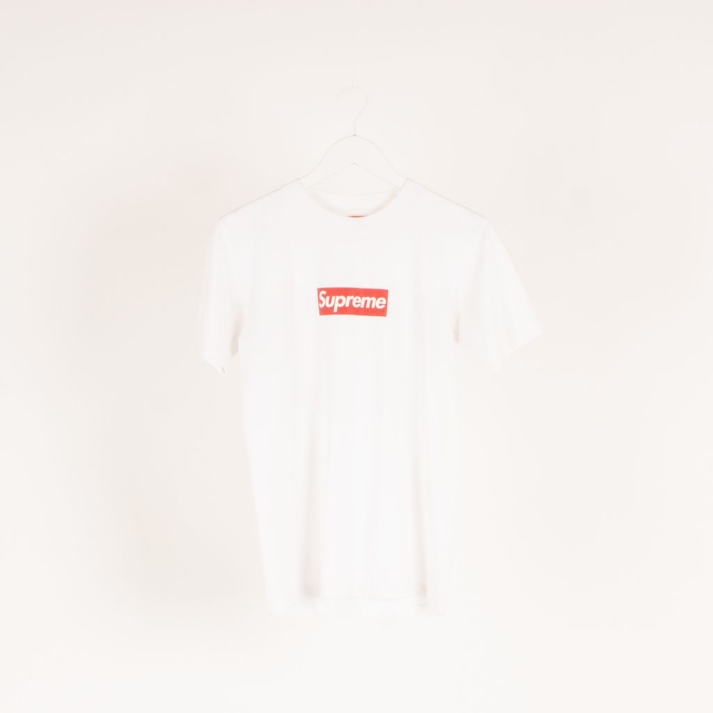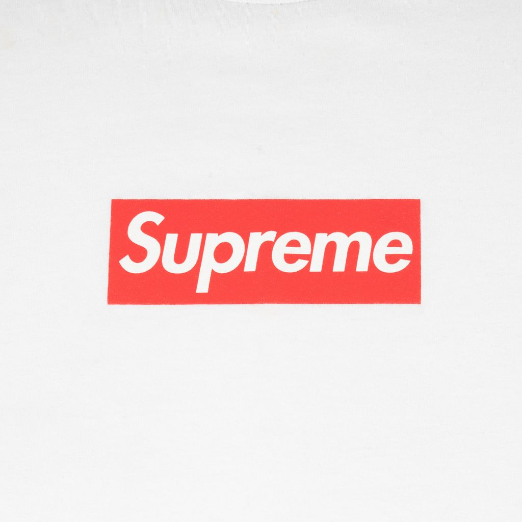 Coming from Supreme's 20th anniversary collection, this clean white tee breathes new life into the box logo. Features Supreme screen printed logo on chest, slim fit, and minor signs of wear. Signs of wear include slight staining under arms.